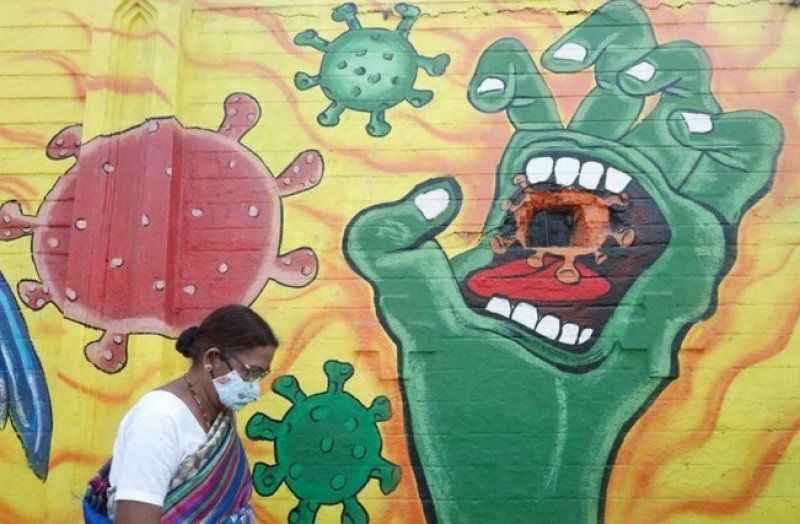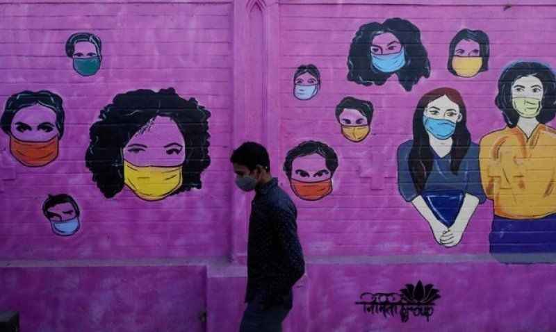 MUMBAİ, HİNDİSTAN 10 Ocak 2022- Koruyucu yüz maskesi takan bir kadın, Hindistan'ın Mumbai kentinde koronavirüsün yayıldığı bir sokakta bir duvar resminin yanından geçiyor.