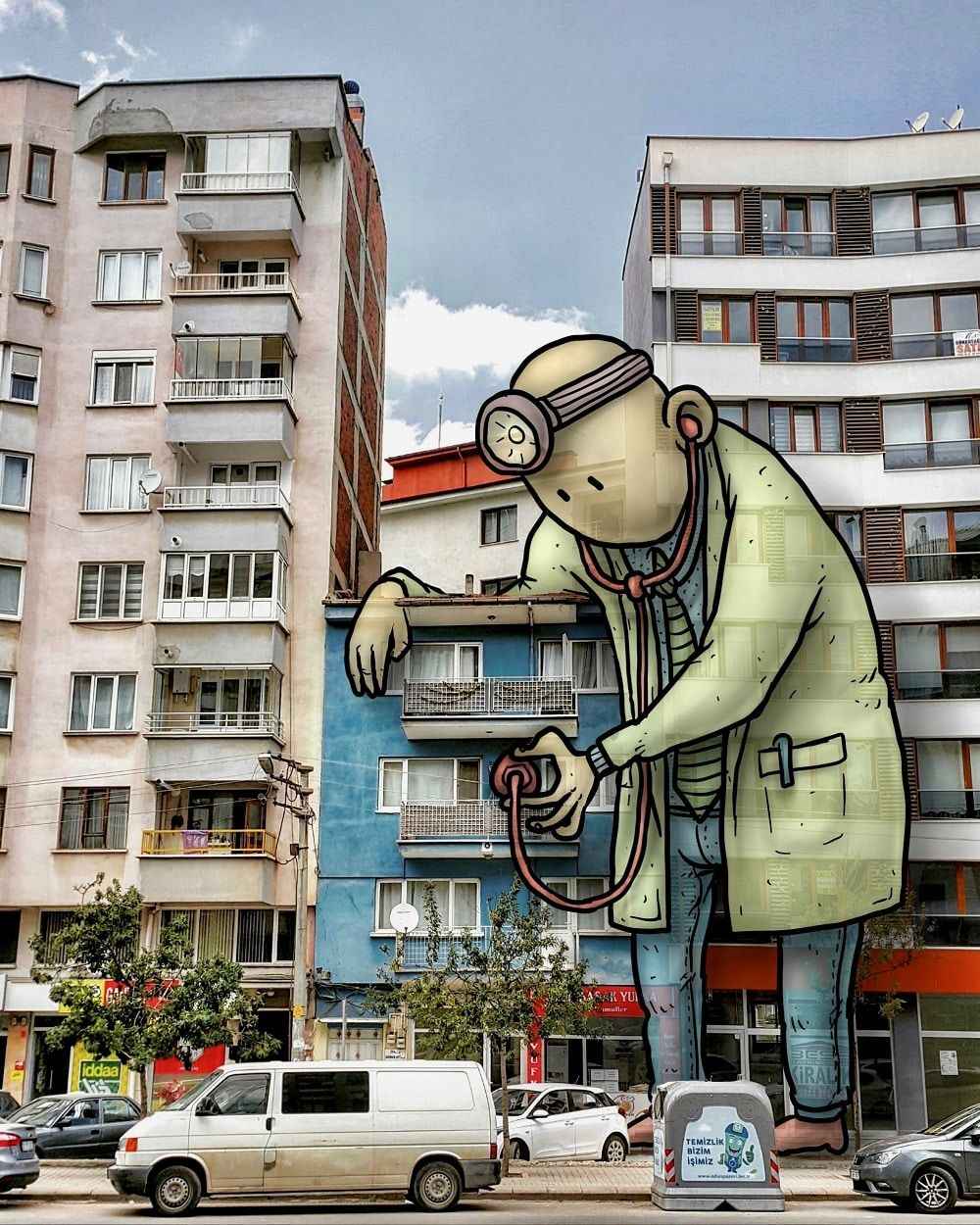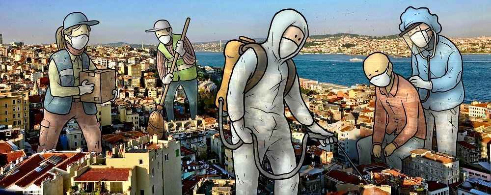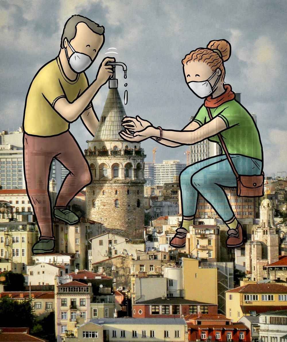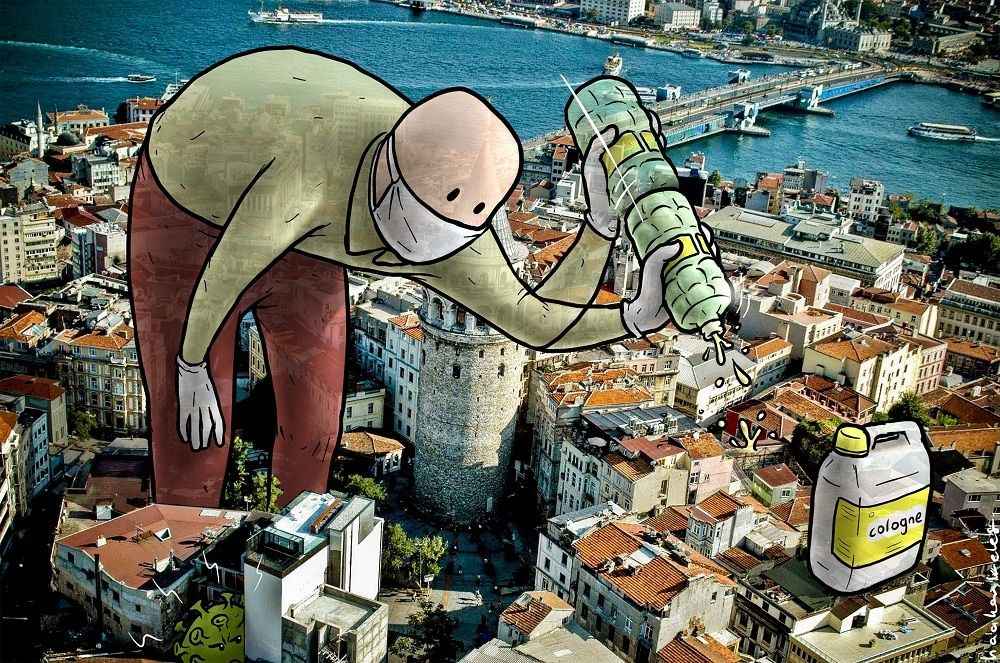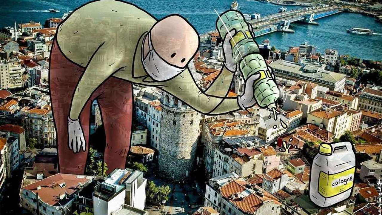 "Herkes kolonya arıyordu. Bunun üzerine şehrin üzerine kolonya dökerek etrafı sterilize eden bir karakter çizdim. Daha sonra sosyal mesafeye dikkate çekmek için Galata Kulesi'ni bir dezenfektan ürünü gibi kullanıp, aralarında mesafeyle birbirine dezenfektan sıkan bir çifti konu ettim. Bazı yaş aralıklarına sokağa çıkma kısıtlaması getirilmesinin ardından da bu süreçte çok önemli misyonları olan temizlik görevlisi, dezenfektan uygulayıcıları, kuryeler ve sağlık çalışanlarını içeren panoramik bir illüstrasyon daha yaptım. Birçok çalışan, biz evde kalalım, sağlığımızı koruyabilelim diye görevi başında. Onlara dikkati çekmek istedim."Keleş, sosyal medya hesabından yayınladığı ve fikirlerini yansıttığı çizimlerinin beğenilmesinden duyduğu mutluluğu dile getirerek, "Alınan tedbirler ve onlara uyma noktasında bilinç oluşmasına katkıda bulunmayı istiyorum." dedi.