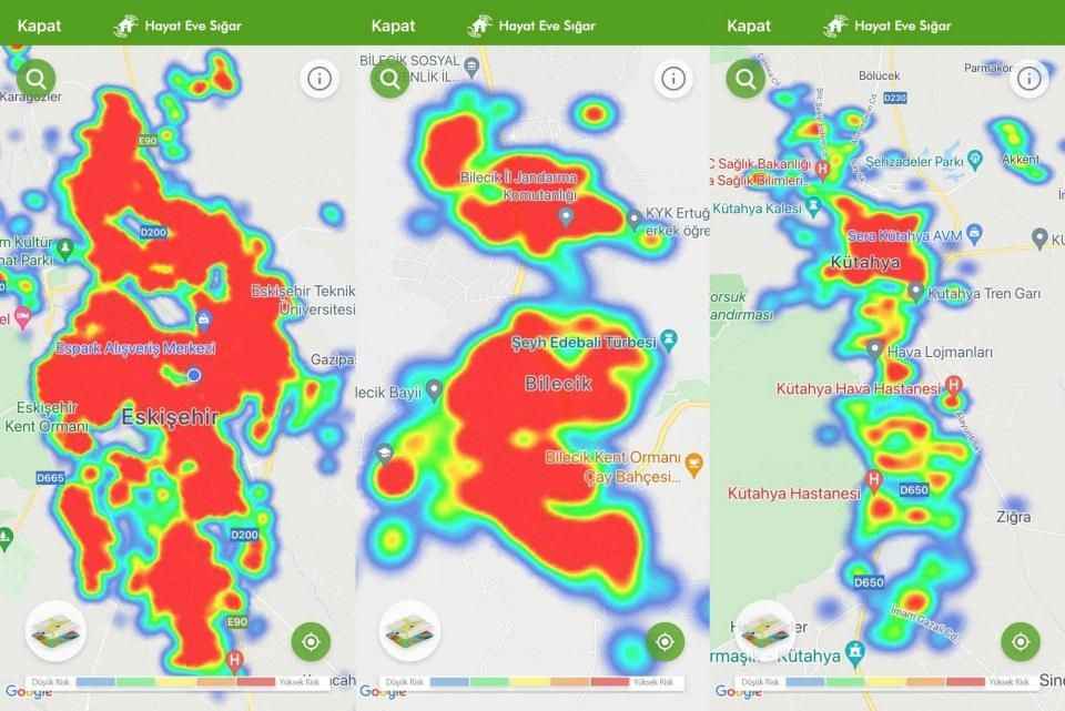 Eskişehir, Bilecik ve Kütahya'da güncellenen vaka sayıları, Hayat Eve Sığar (HES) uygulamasındaki risk haritasına da yansıdı. Kütahya’da düşen vakalar nedeniyle yeşil alanlar çoğalırken, Bilecik vaka düşüşüne rağmen haritada, 'yüksek risk' anlamına gelen 'kırmızı' renkte yer aldı. Eskişehir'de ise harita artan vakalarla birlikte tamamen kızardı.