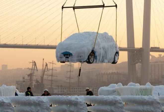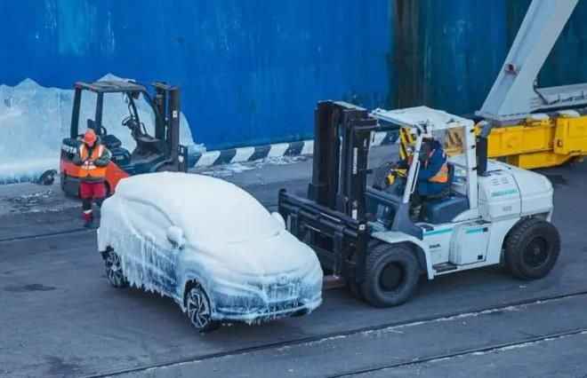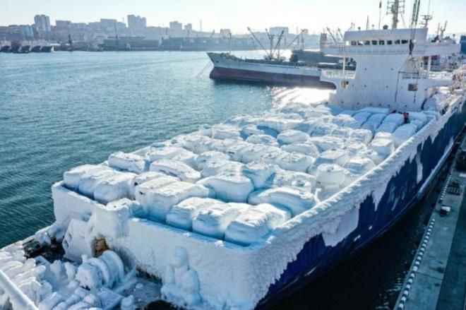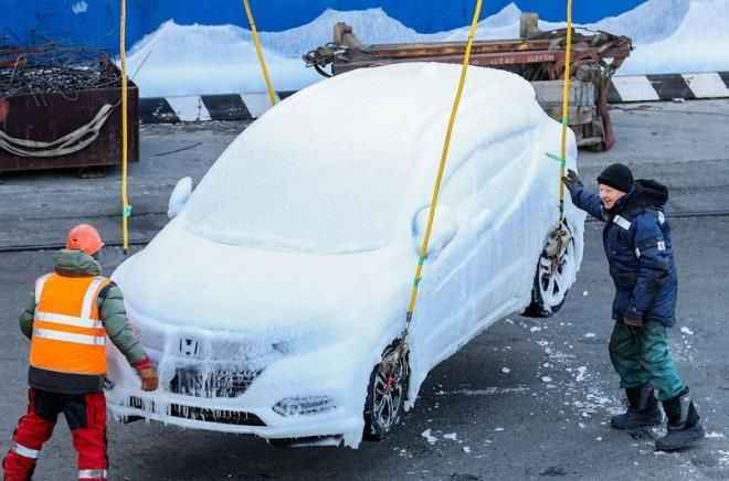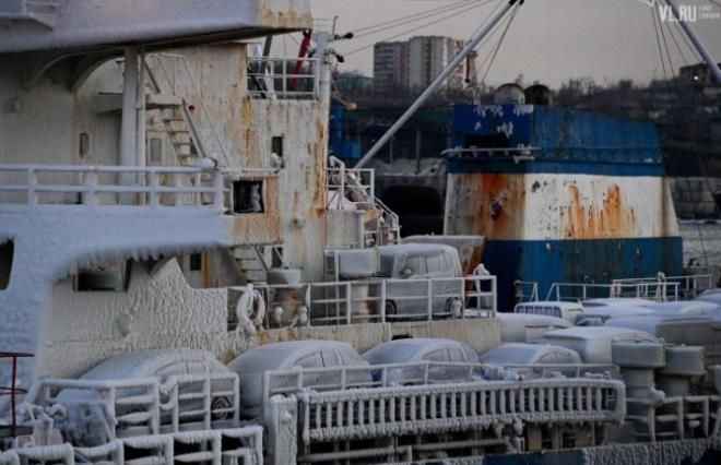 Karın yanı sıra denizin dalgalı olmasından dolayı araçların üzerine su geldi. Gemi, Vladivostok şehrine gelene kadar -19'a kadar düşen soğuk havadan dolayı araçların tümü buzla kaplandı.