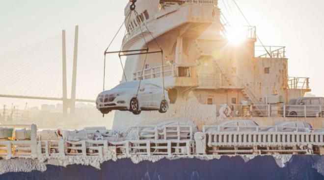 Japonya'dan alınan yüzlerce ikinci el otomobil, Rusya'ya getirildiği sırada Japon denizinde üzerlerine kar yağdı.