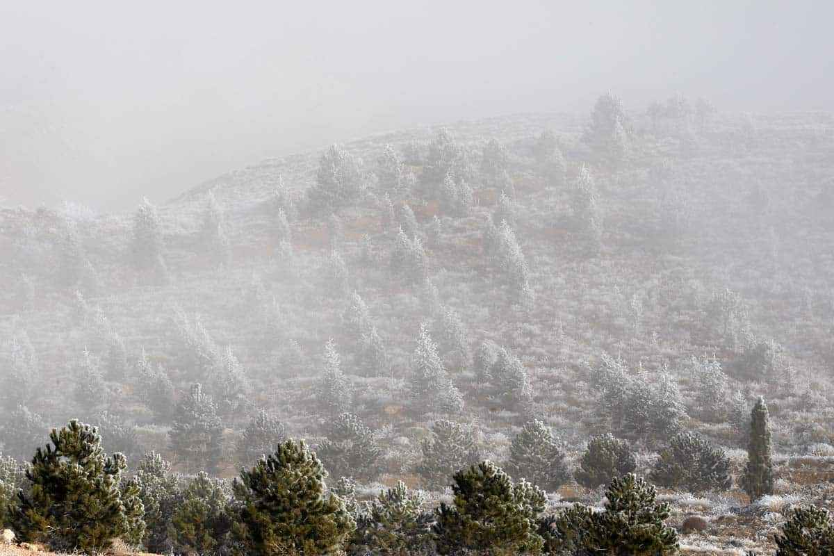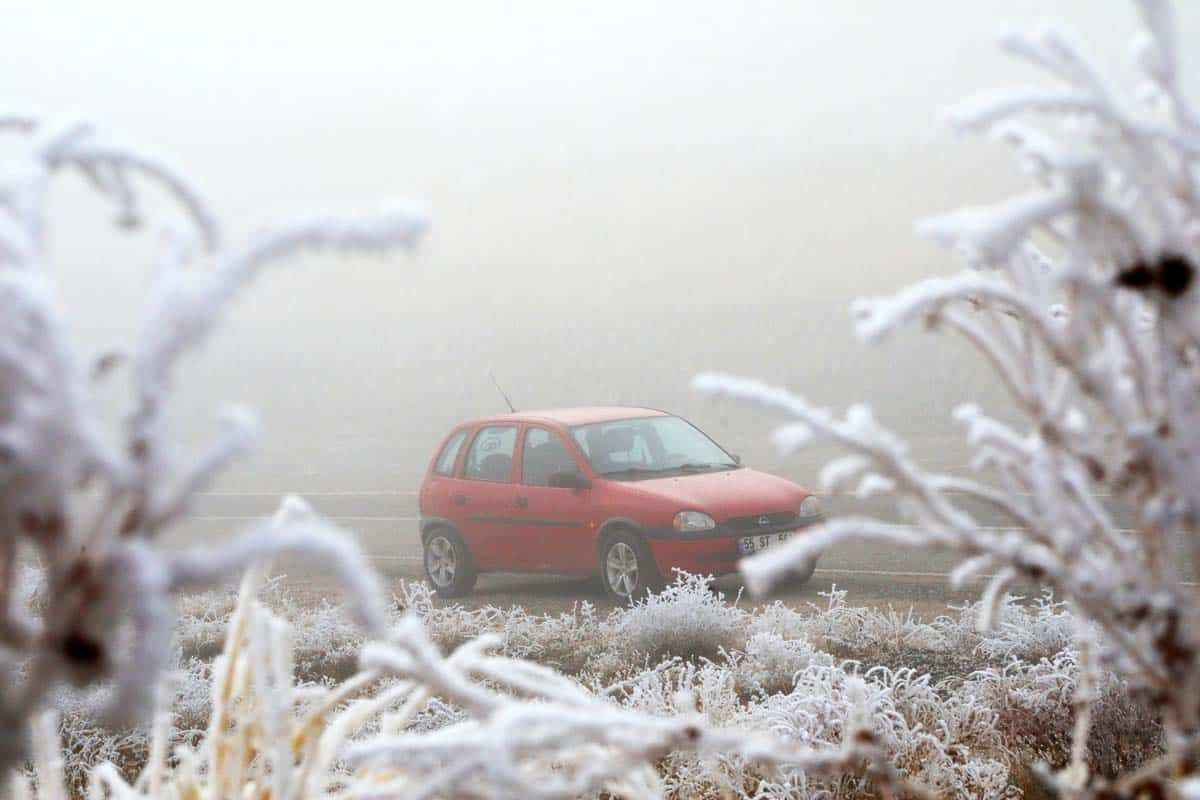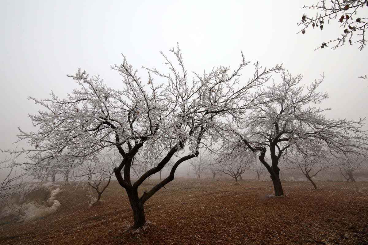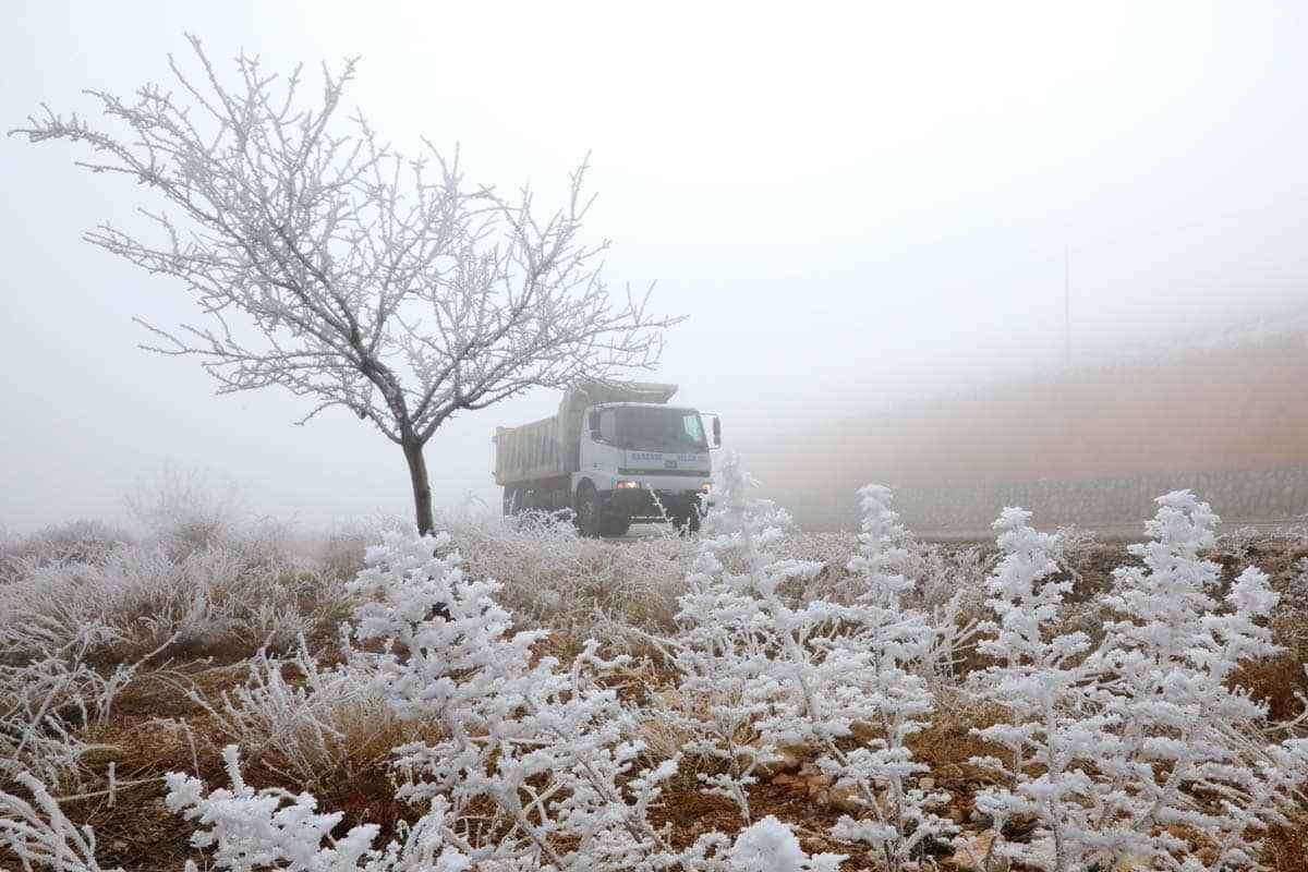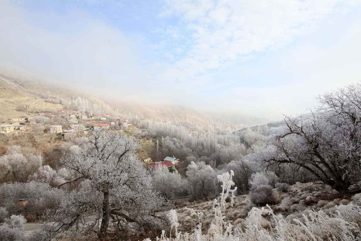 İlçede sabah etkisini gösteren sis sonrası oluşan kırağı, ağaç, yol ve kayısı bahçelerini beyaza bürüdü.