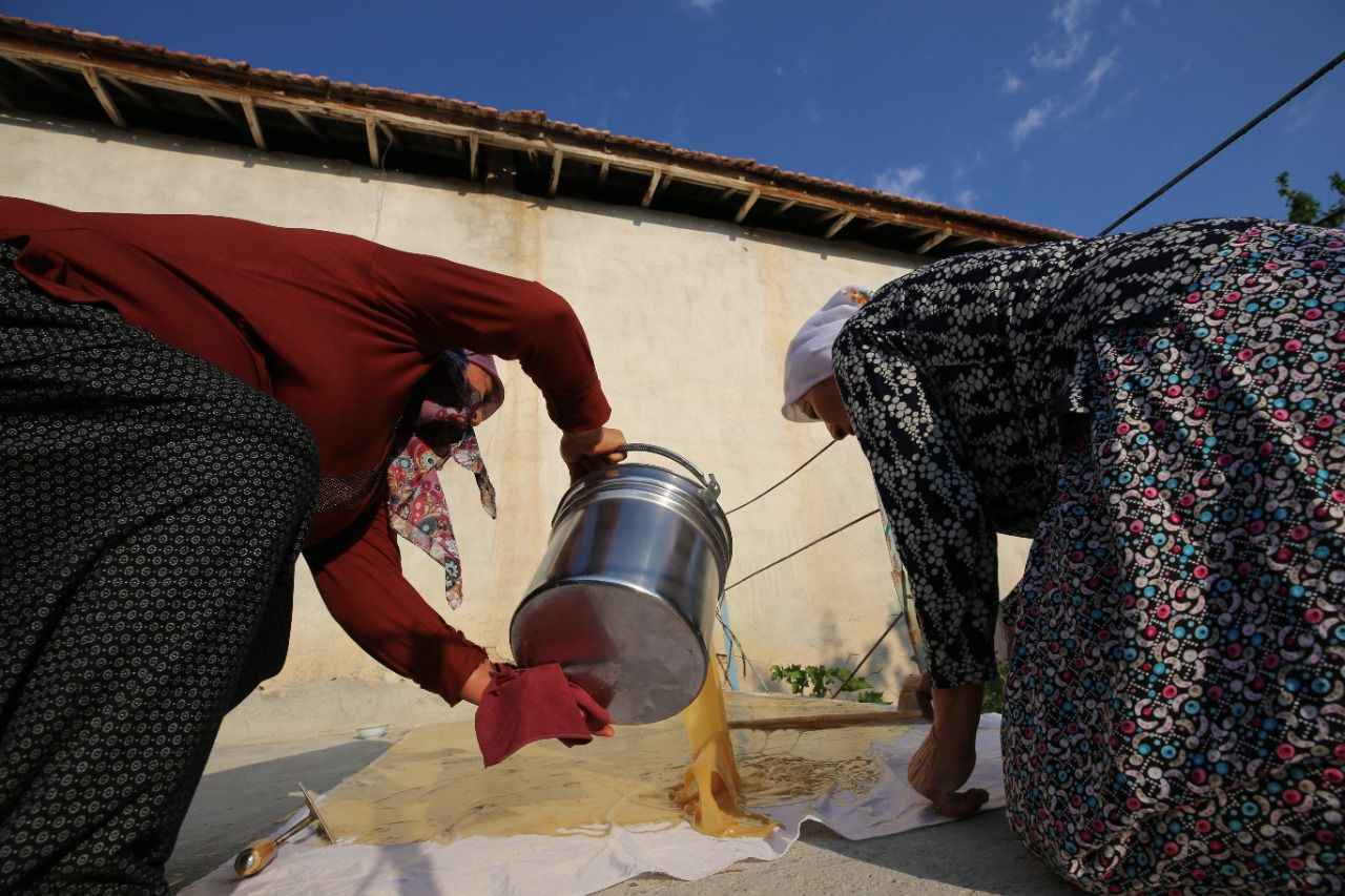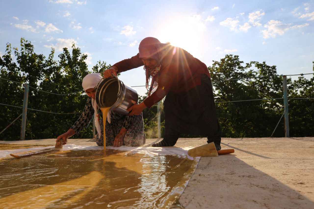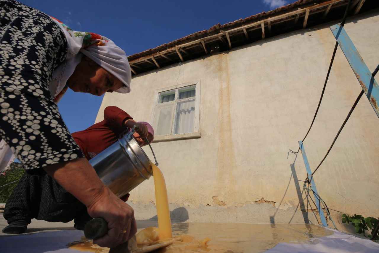 Bir süre kaynatıldıktan sonra kıvama getirilen şıra, kap kacak yardımıyla damlara taşınıp bezlere serildikten sonra üzerine haşhaş serpilerek güneşte kurutulmaya bırakılıyor.