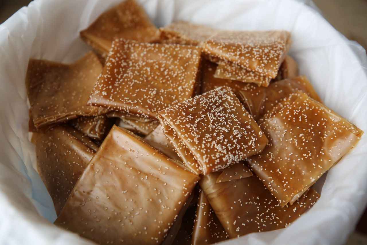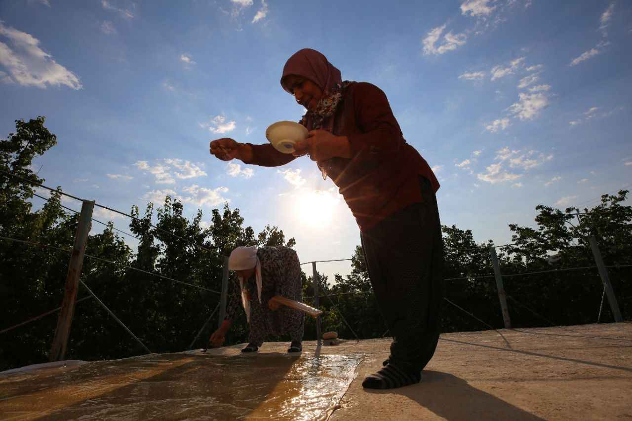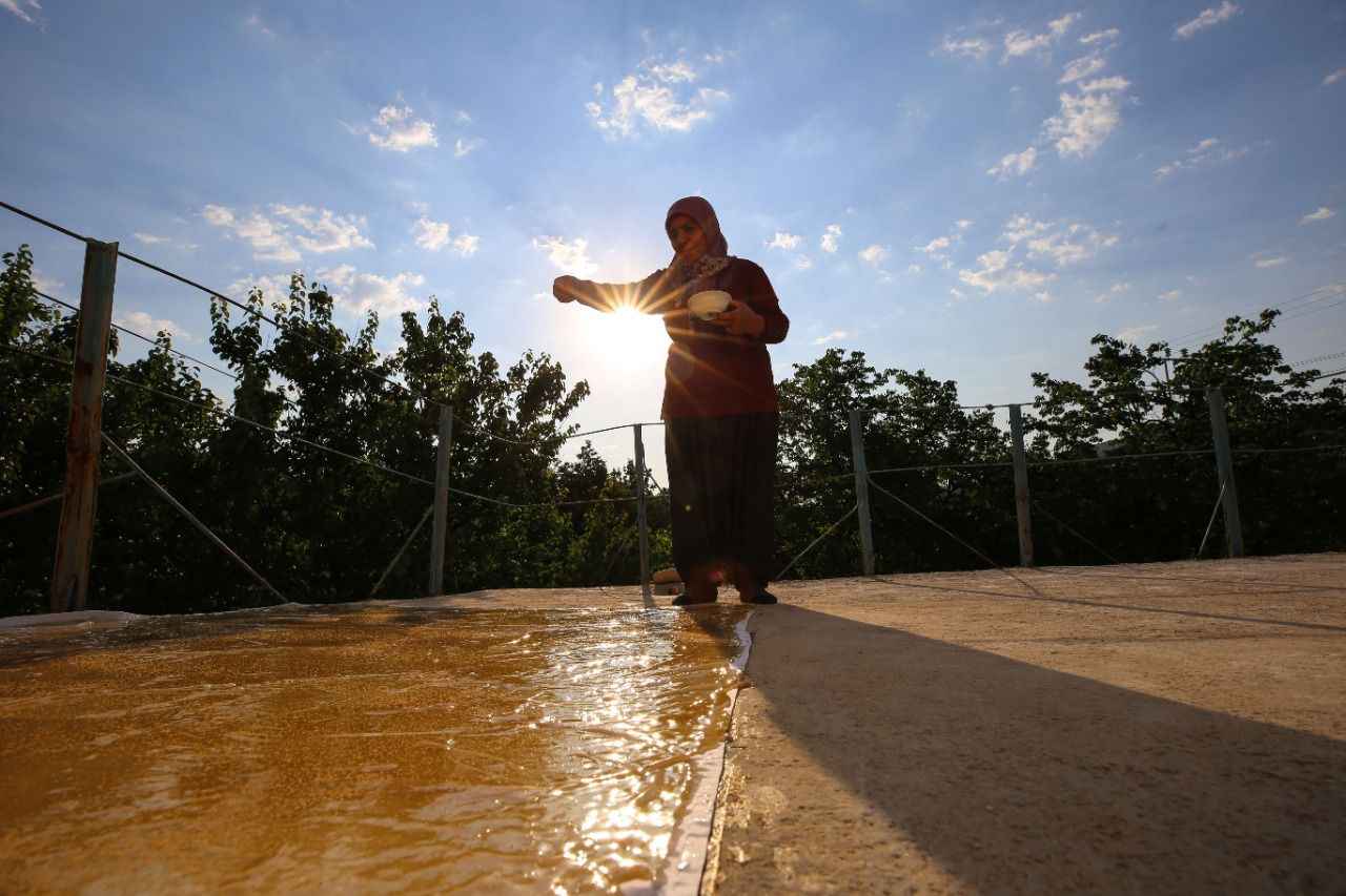 Bir süre kaynatıldıktan sonra kıvama getirilen şıra, kap kacak yardımıyla damlara taşınıp bezlere serildikten sonra üzerine haşhaş serpilerek güneşte kurutulmaya bırakılıyor.