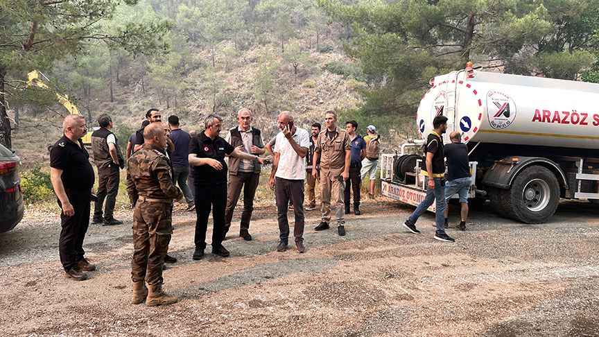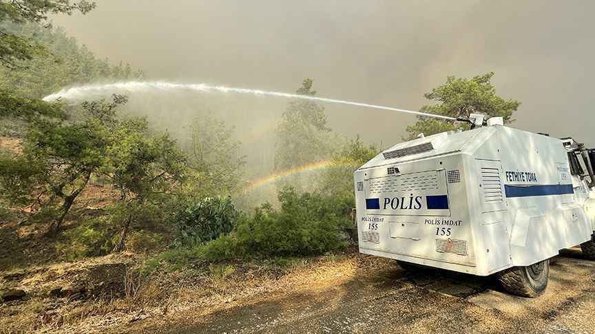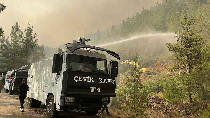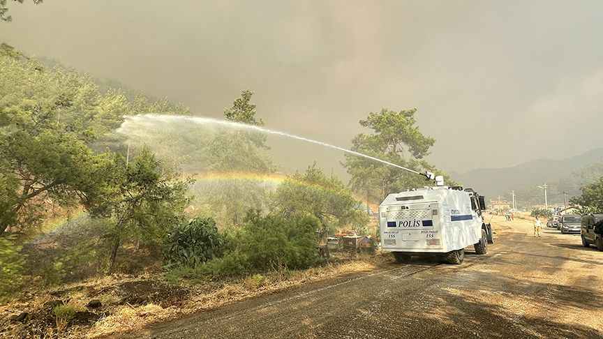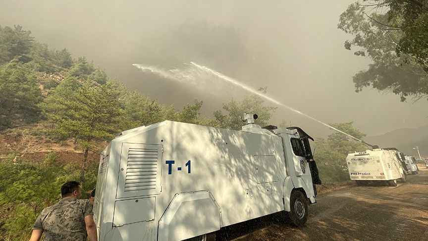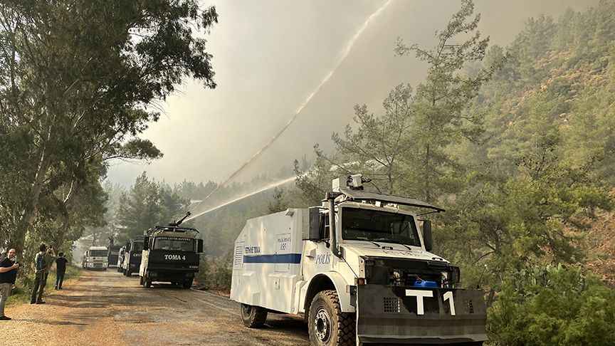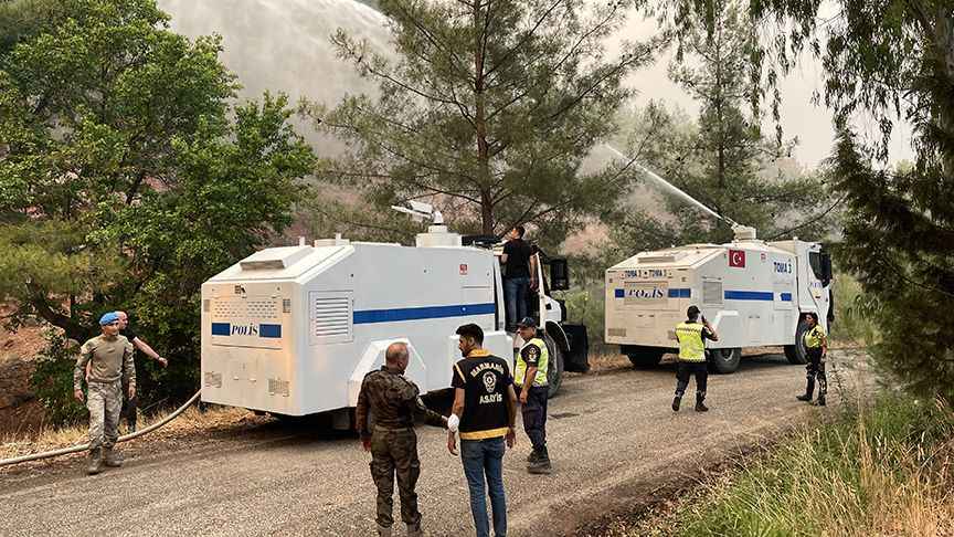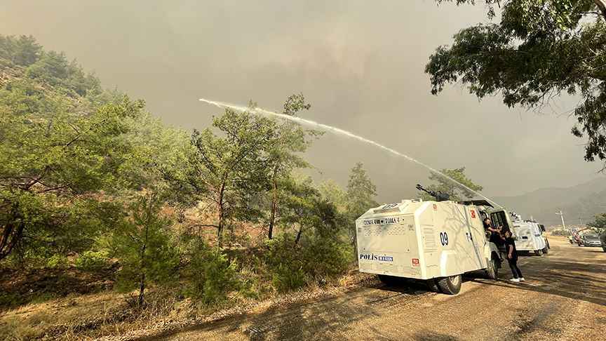Emniyet ile jandarma ekiplerince, bölgedeki evlerin yakınında bulunan ağaçlara yangının sıçramaması için TOMA'larla su sıkılıyor.