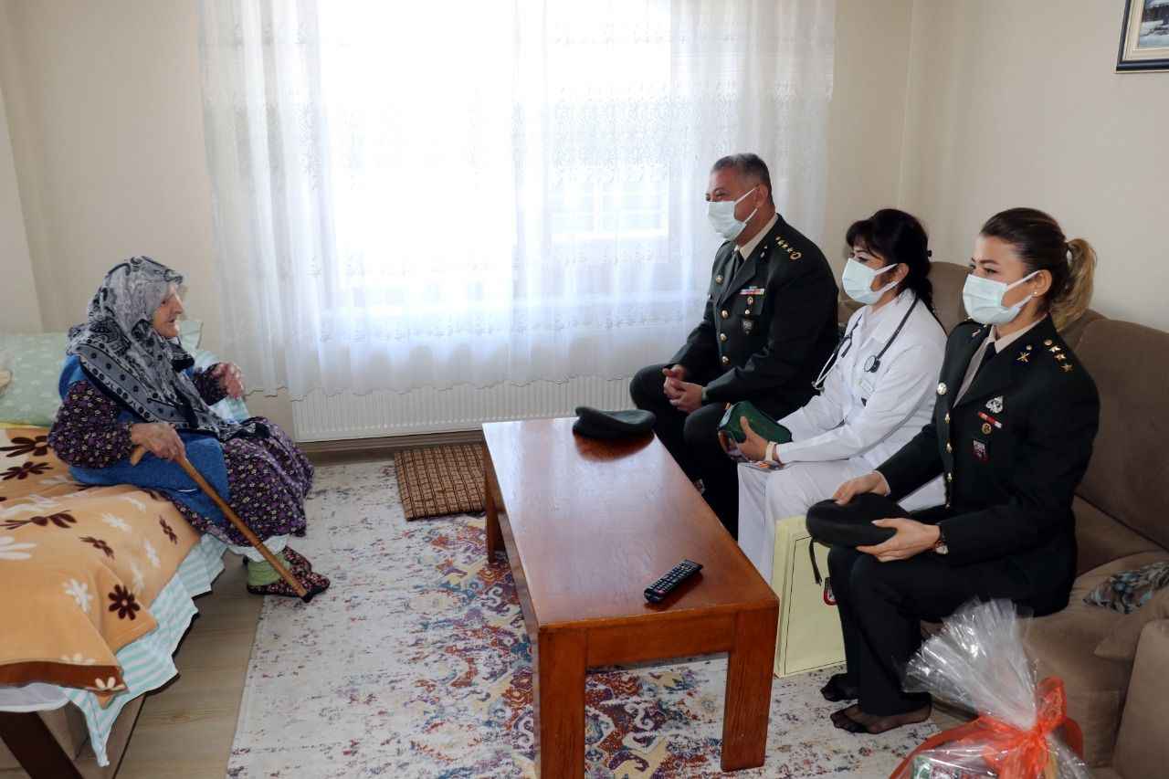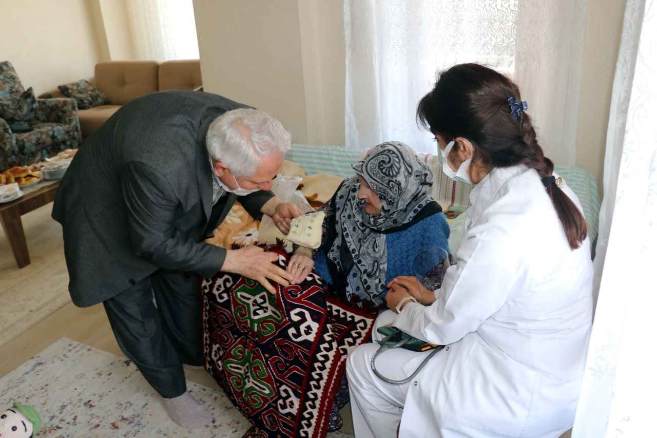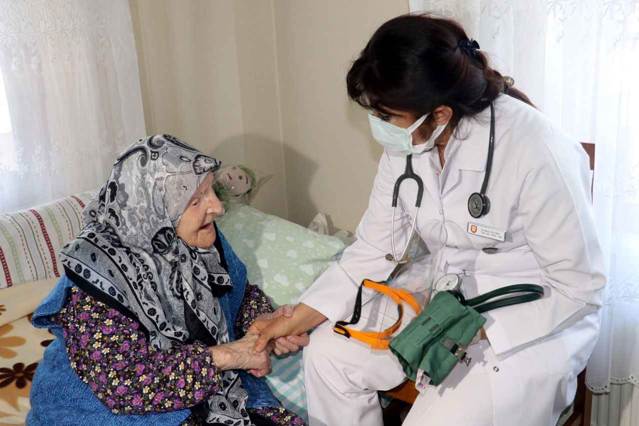 Tabip Albay Öztürk tarafından sağlık kontrolünden geçirilen Zeliha nine, ördüğü yün çoraplardan hediye ettiği konuklarını kapıya kadar uğurladı.