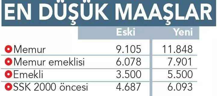 En düşük emekli maaşı ise 5 bin 500 lira olacak. Sıra zamlı maaşların ödenmesine geldi. Takvim de belli oldu. İşte yasalaşan yeni memur maaşlarında ortaya çıkan tablo...