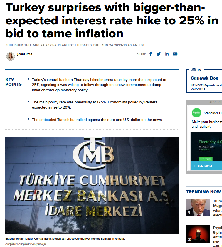 CNBC:Türkiye, enflasyonu dizginlemek amacıyla beklenenden daha büyük bir faiz artışıyla %25′e sürpriz yaptı
