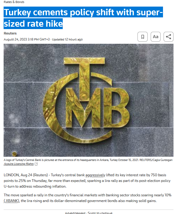 LONDRA, 24 Ağustos (Reuters) - Türkiye merkez bankası Perşembe günü agresif bir şekilde faiz oranını 750 baz puan artırarak %25'e çıkardı; bu, beklenenin çok üzerinde bir rakamdı ve toparlanmayı ele almak için seçim sonrası politikası U dönüşü kapsamında lirada yükselişe yol açtı. şişirme.