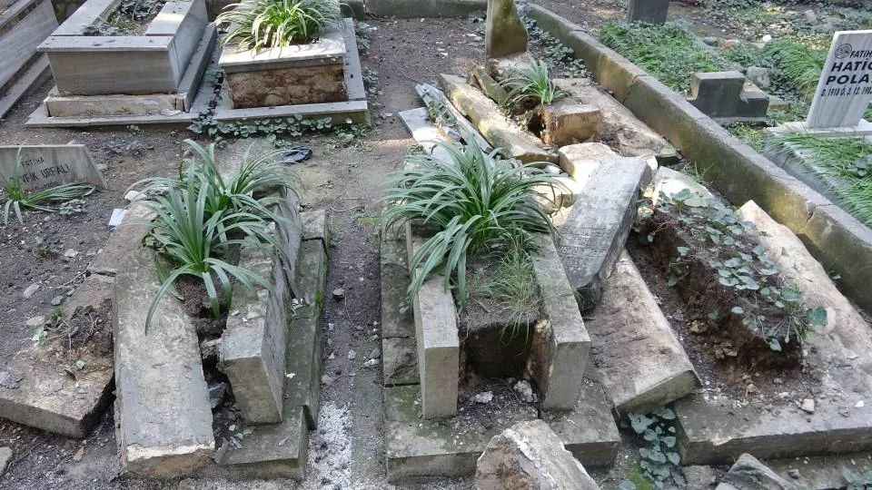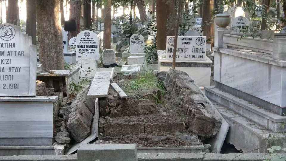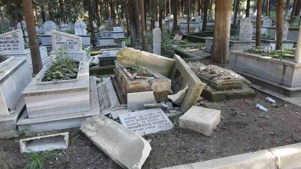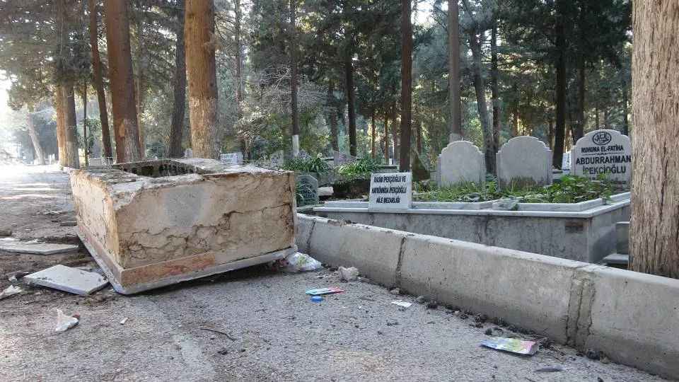 Depremin yıkıcı etkisi sadece binalara olmazken Antakya Asri Mezarlığında bazı mezarlarda hasar oluşurken bazılarının da yola uçtuğu görüldü.