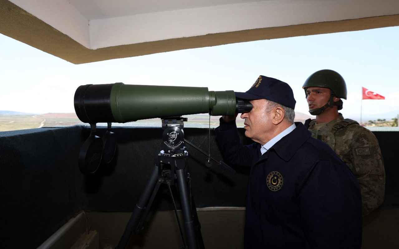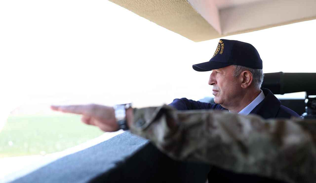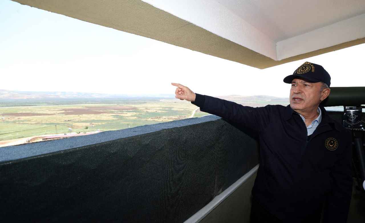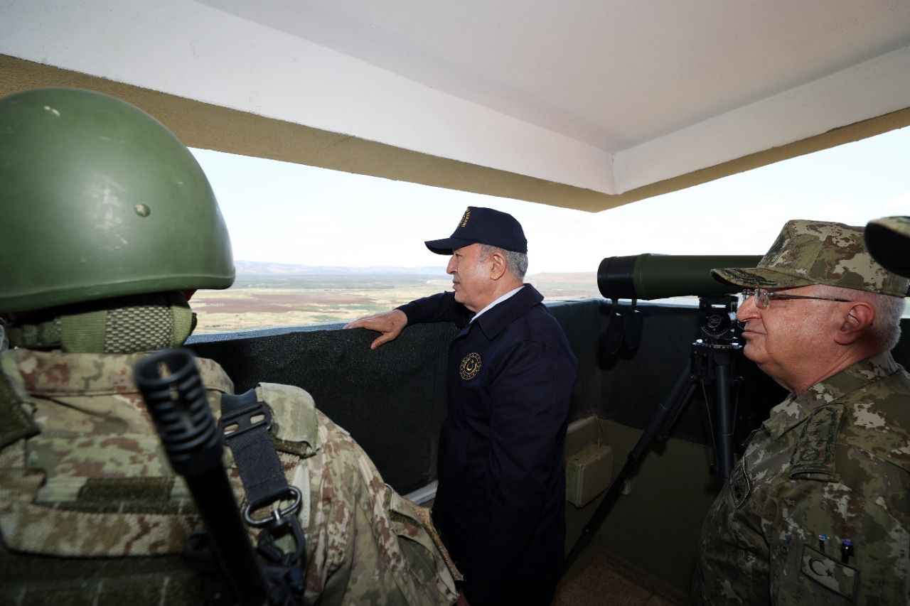 Hudut Karakol Komutanı'na Türk bayrağını öperek emanet eden Akar, daha sonra tedbirlere ilişkin brifing aldı, gözetleme kulesine çıkarak hududu inceledi.
