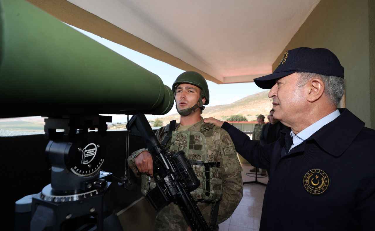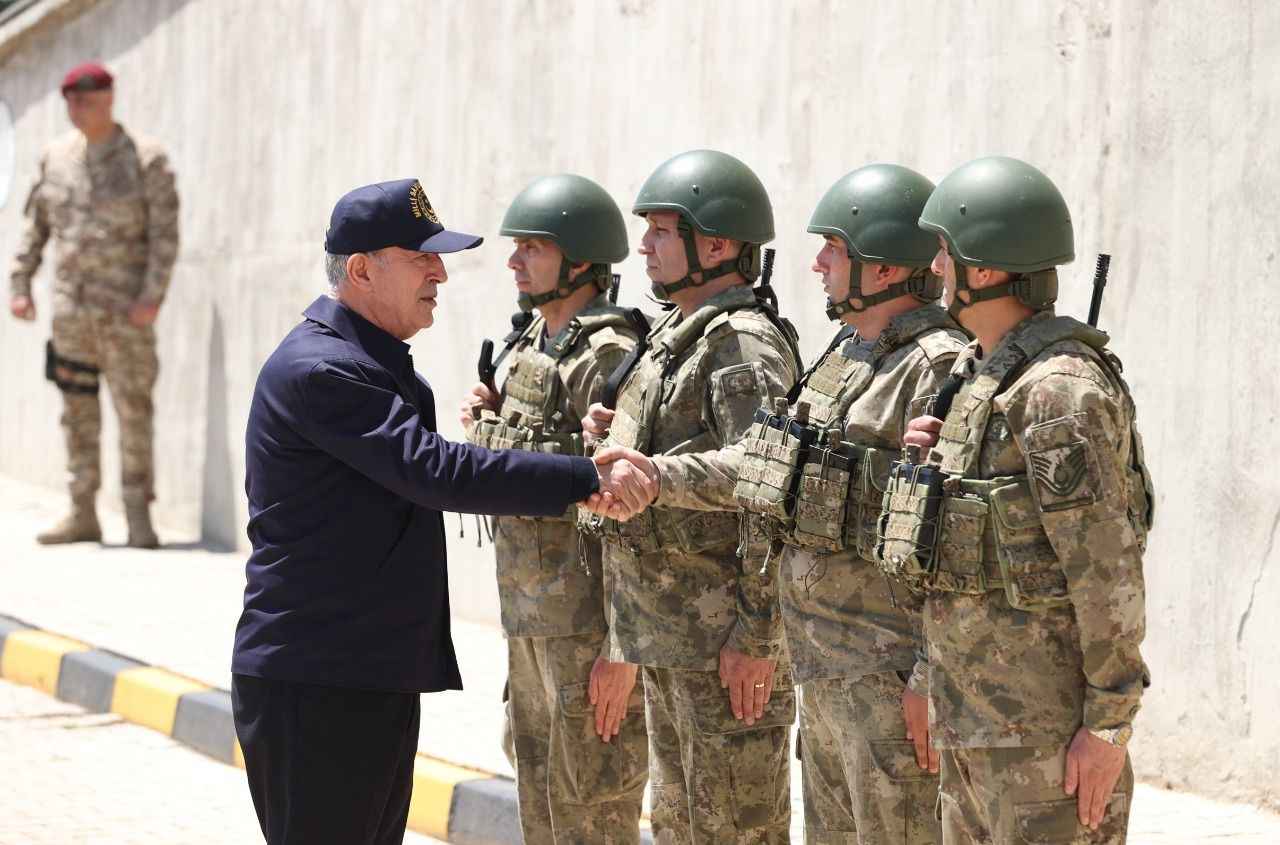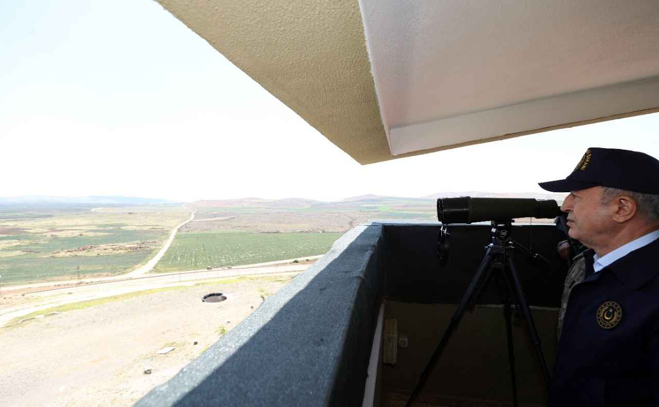 Hudut Karakol Komutanı'na Türk bayrağını öperek emanet eden Akar, daha sonra tedbirlere ilişkin brifing aldı, gözetleme kulesine çıkarak hududu inceledi.