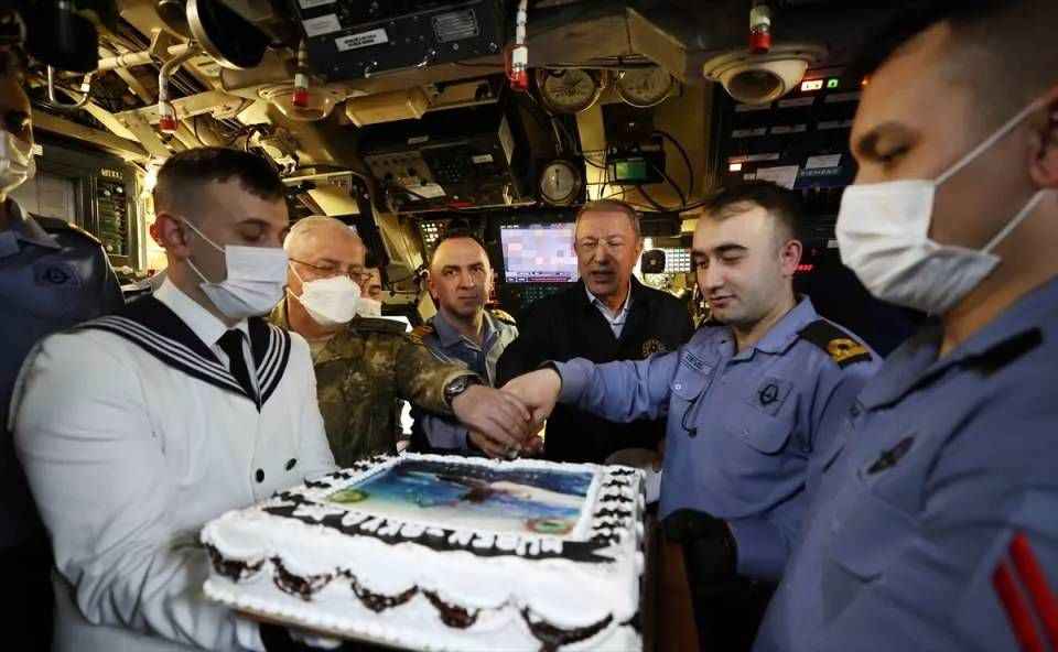 Başarıyla gerçekleşen atış dolayısıyla hazırlanan pastanın Bakan Akar, Genelkurmay Başkanı Orgeneral Güler ve denizaltı personeli tarafından kesilmesinin ardından TCG Preveze limana döndü.