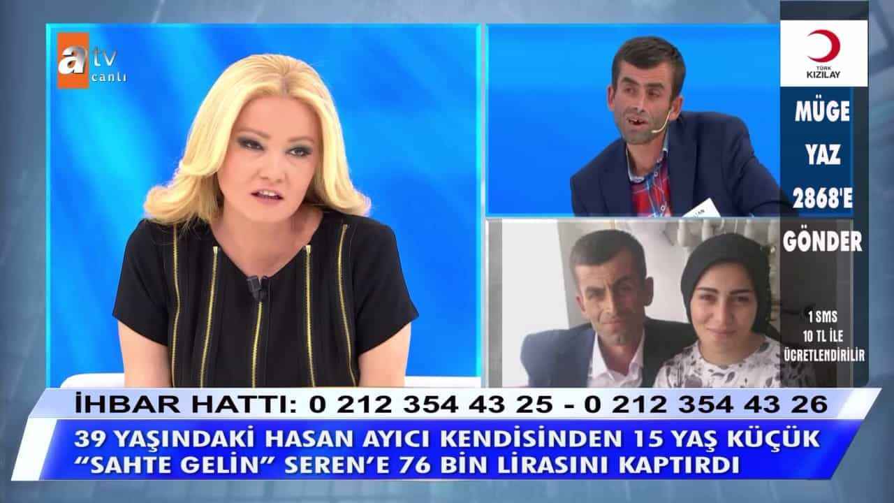 Müge Anlı canlı yayınında bugün, akılalmaz bir dolandırıcılık hikayesi ele alındı. 39 yaşındaki Hasan Ayıcı, sahte gelin tarafından dolandırılarak 76 bin lirasından oldu. Kendisinden 17 yaş küçük Seren isimli şahısın paraları da alıp kaçtığını iddia eden Hasan Ayıcı, Müge Anlı'dan yardım istedi. Canlı yayında Seren isimli kişi hakkında arka arkaya gelen telefonlar şoke etti. Son olarak Atv Müge Anlı ile Tatlı Sert yayınına bağlanan isim, Hasan Ayıcı'yı sahte gelinle tanıştıran Ahmet Büyükodacı oldu. Büyükodacı'nın sözleri Müge Anlı'yı çileden çıkarttı.
