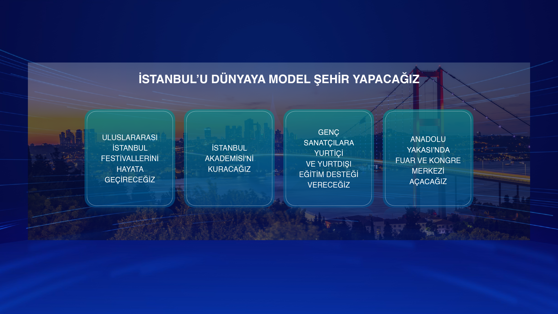 Kültür sanat ve turizm ile yaşayan bir İstanbul vadediyoruz. İstanbul için yeni tesisler kuracağız. Mimarisiyle gurur duyduğumuz Atatürk Kültür Merkezimizin bir benzerini de Anadolu Yakası’nda kurulmasını isteyen hemşehrilerimiz var. Anadolu Kültür Merkezi’nin temellerini hızla atacağız.