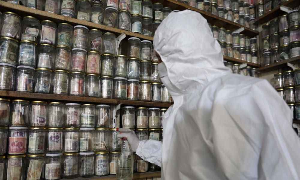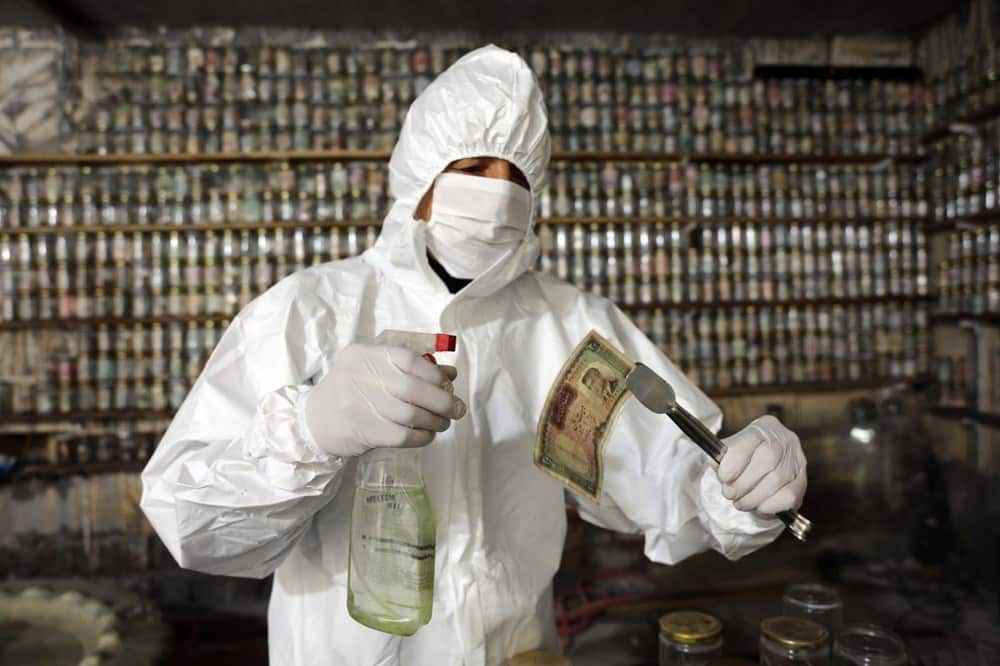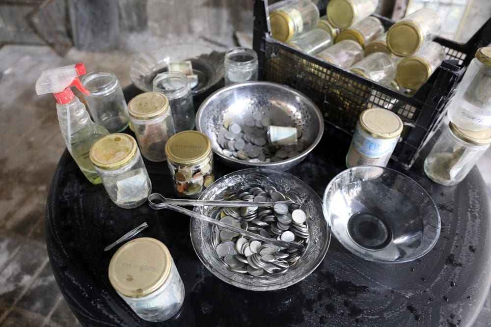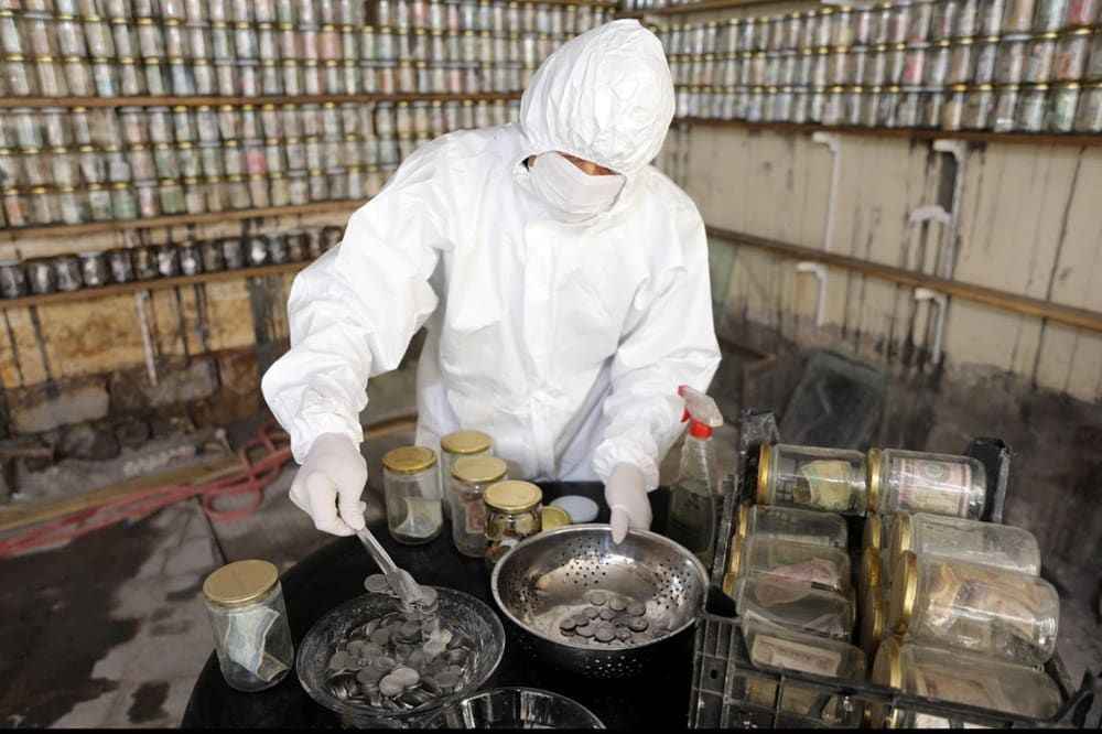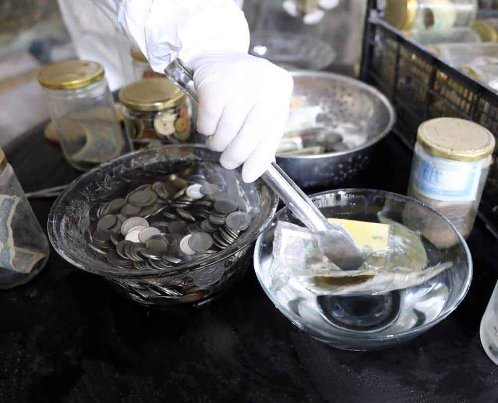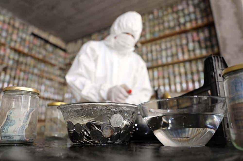 Koruyucu tulum giyip, maske ve eldiven takan Esat Kaplan, cımbız ile paraları tek tek cam fanusun içerisindeki dezenfekte ilacında bir süre bekletti ve ardından kavanozlara yerleştirdi.
