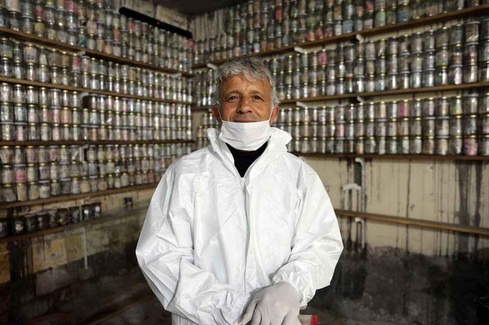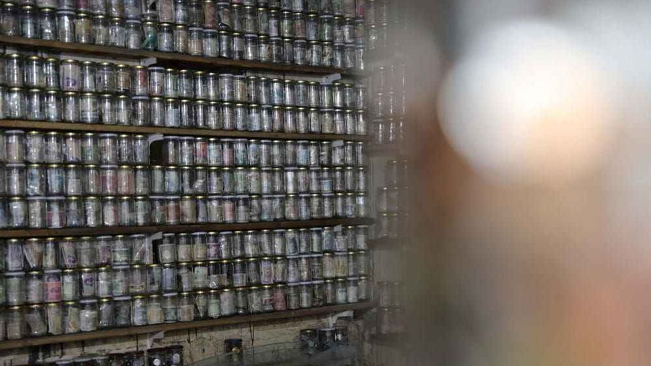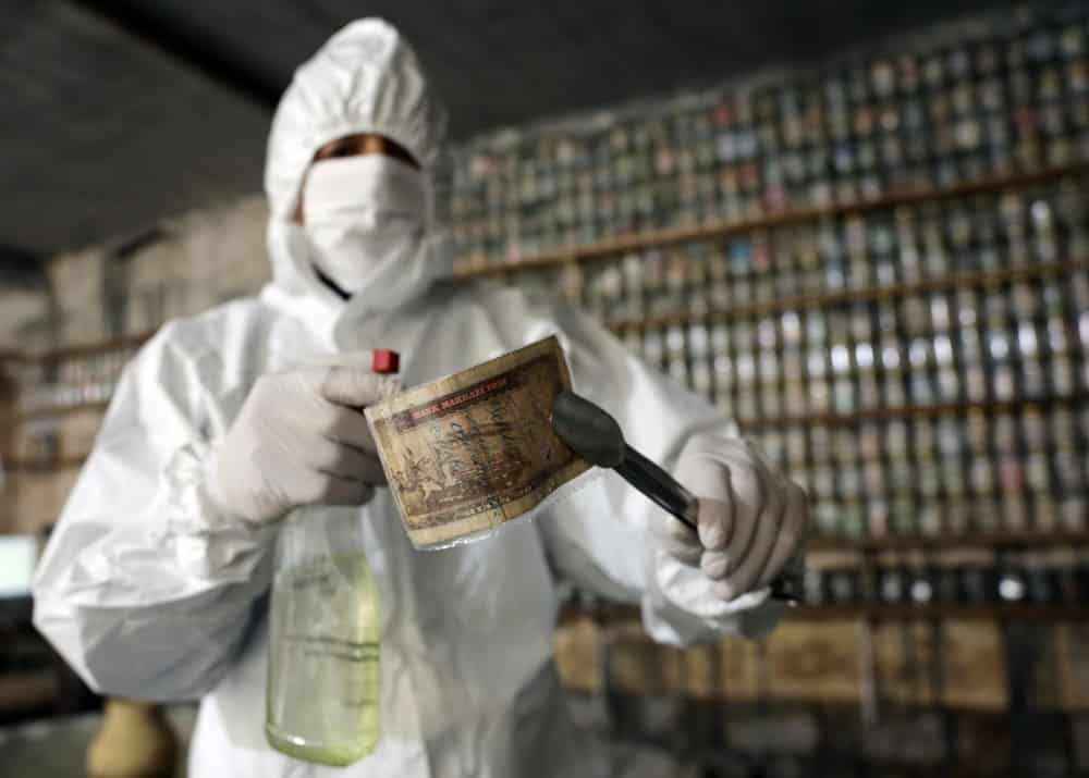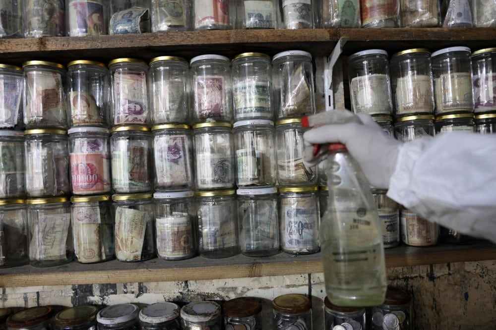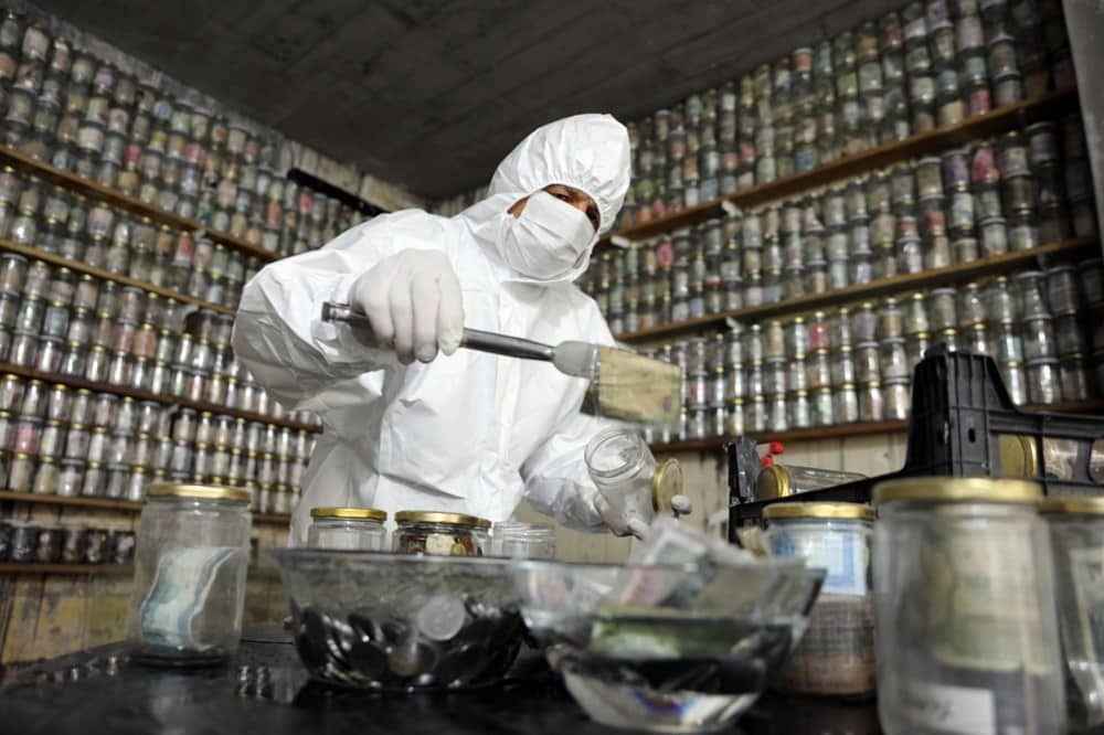 Koruyucu tulum giyip, maske ve eldiven takan Esat Kaplan, cımbız ile paraları tek tek cam fanusun içerisindeki dezenfekte ilacında bir süre bekletti ve ardından kavanozlara yerleştirdi.