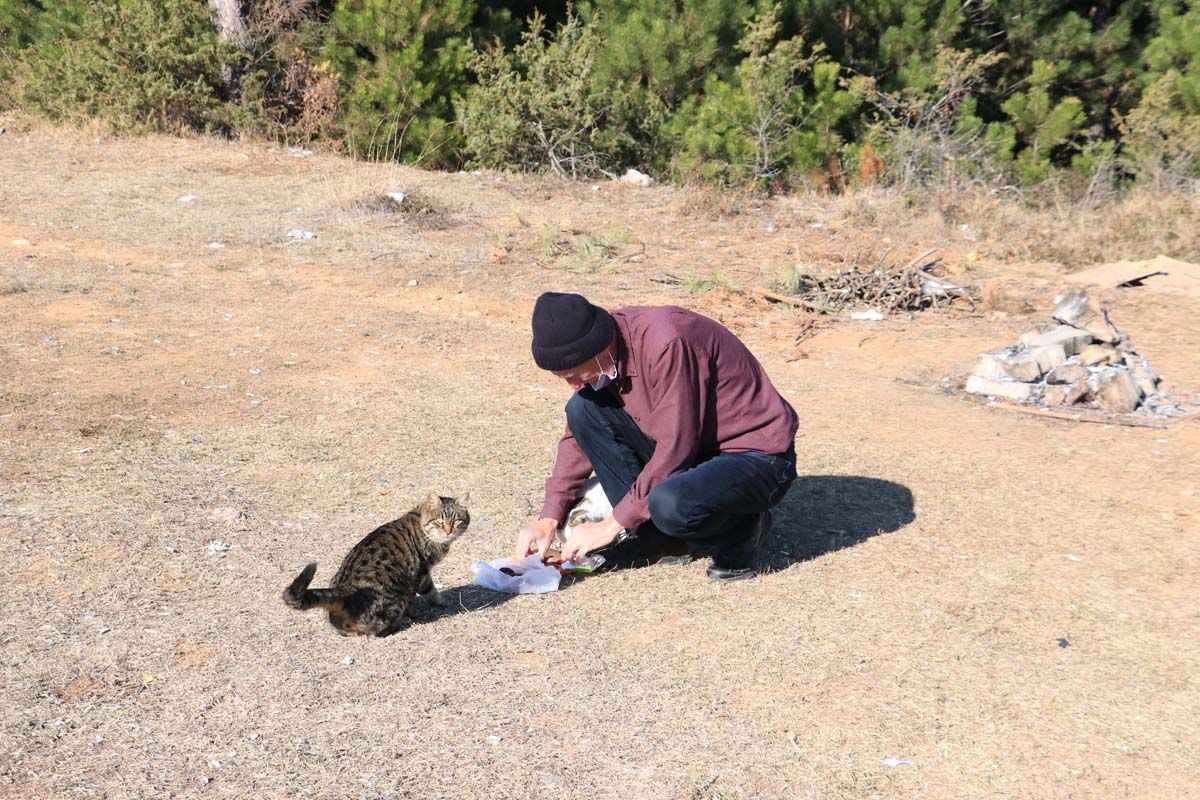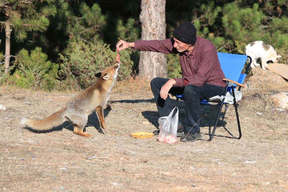 Evinden çıkarak yaklaşık 4 kilometre uzaklıktaki ormanlık alana giden Çelik, burada kendisini bekleyen iki kedi ile tilkiyi besliyor.