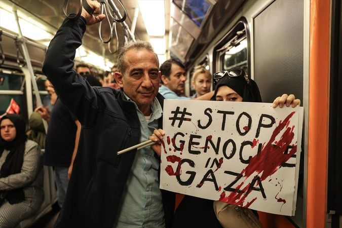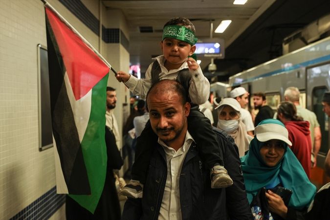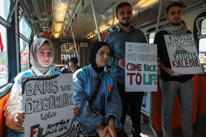 Katılımcılardan bazıları "Hepimiz Filistinliyiz" yazılı bantları kafalarına takarken, kimi vatandaşlar da çeşitli dillerde "Katliam bitsin, çocuklar ölmesin" ve "Filistinli çocukların sesi ol" yazılı dövizler taşıdı.