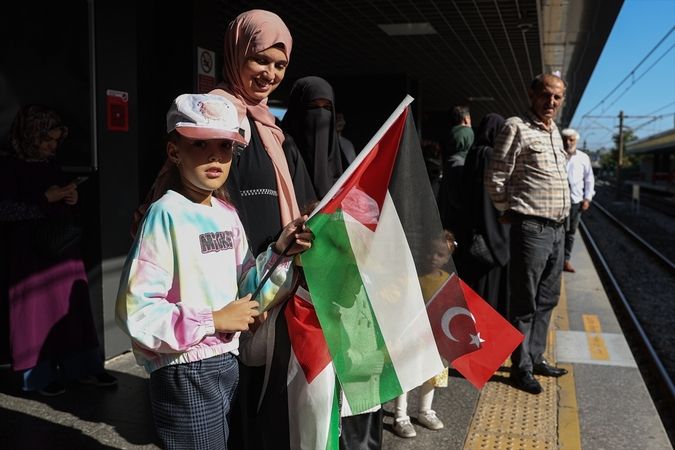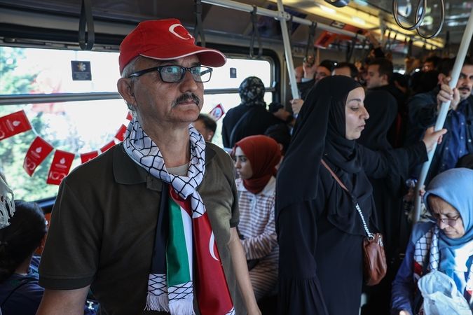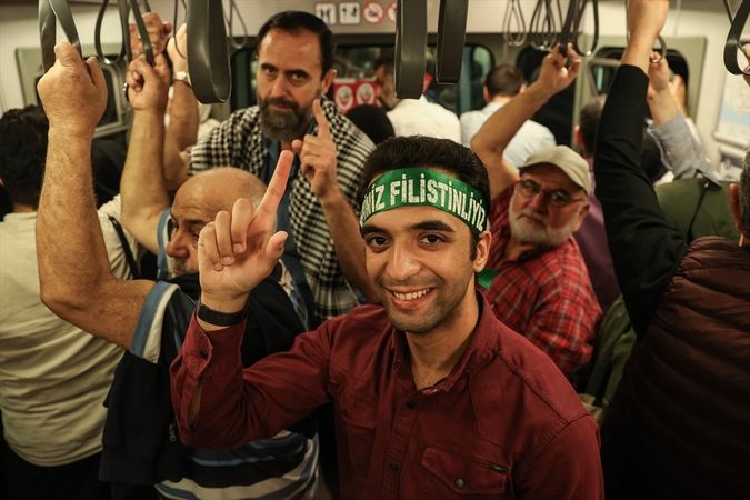 Bazı vatandaşlar, "Hepimiz Filistinliyiz" yazılı bantları kafalarına taktı.