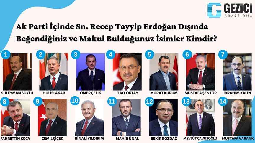 Araştırmaya katılanlardan yüzde 28,5'i Süleyman Soylu‟yu beğendiğini ifade ederken yüze 21,4'ü Hulisi Akar'ı, yüzde 14,3'ü Ömer Çelik'i, yüzde 10'u Fuat Oktay'ı, yüzde 9,6'sı Murat Kurum'u, yüzde 5,3'ü de Mustafa Şentop'u beğendiğini söyledi.