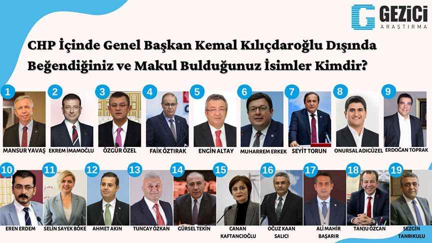 CHP içinde Genel Başkan Kemal Kılıçdaroğlu dışında beğenilen isimlerin kim olduğuna ilişkin soruya ise katılımcıların yüzde 21,2'si Mansur Yavaş cevabını verdi. Katılımcılardan yüzde 18,1'i Ekrem İmamoğlu'nu, yüzde 13,4'ü ise Özgül Özel'i beğendiğini söyledi.