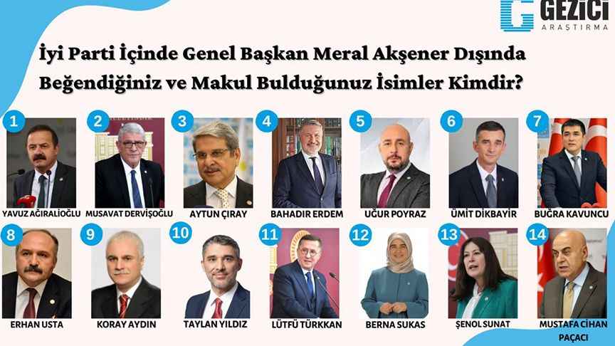 İyi Parti'de Genel Başkan Meral Akşener'in ardından en beğenilen ismin Yavuz Ağıralioğlu olduğu belirlendi. Ağıralioğlu'nu Müsavat Dervişoğlu ve Aytun Çıray izlerken, Bahadır Erdem dördüncü sırada yer aldı.