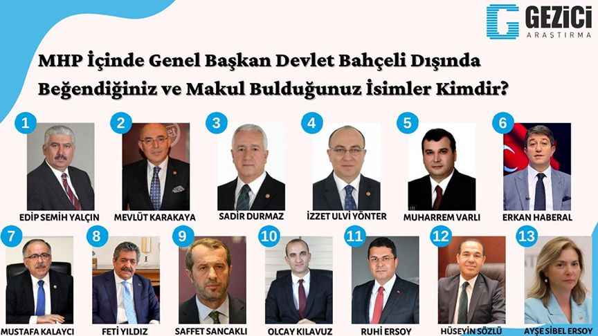 MHP içinde ise katılımcılardan yüzde 15,2’si Edip Semih Şahin, yüzde 12,9’u Mevlüt Karakaya cevabını verdi. Katılımcıların yüzde 10,4’ü Sadir Durmaz cevabını verirken, aynı zamanda İzzet Ulvi Yönter, Muharrem Varlı, Erkan Haberal da beğenilen isimler arasında yer aldı.