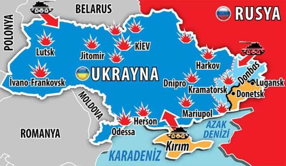 İlk plan: DONBAS 2014’TEKİ SINIRINA DÖNER Mİ? Ordularına hareket emri vererek müzakare masasını deviren Putin, koşullar kendi lehine değişince yeniden diplomasiye dönebilir. Bu plana göre dün Ukrayna genelinde askeri hedefleri vuran ve kuzeyden Kiev’e kadar dayanan Putin, Donbas’taki ayrılıkçılar 2014 sınırlarına ulaşınca diplomasi kanalını açacak.