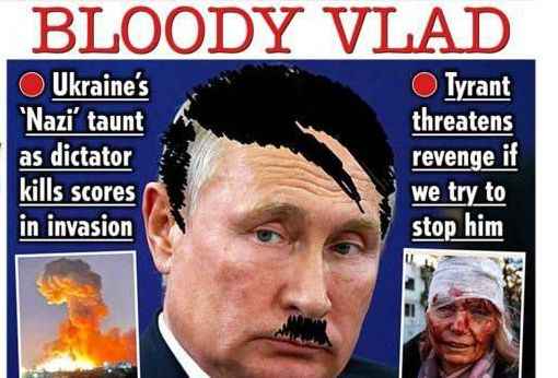 Metro'nun manşeti ise "Avrupa'da savaş". Zelenskiy'nin benzetmesi nedeniyle gazete, Putin fotoğrafının ardına bir Hitler fotoğrafı yerleştirdi.