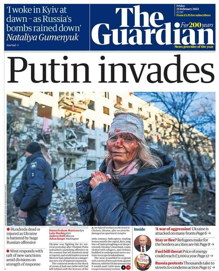 The Guardian gazetesi, "Putin işgal etti" manşetiyle çıkarken, okurlarıyla diğer pek çok gazete gibi hava saldırılarında yaralanmış bir kadının fotoğrafını paylaştı.