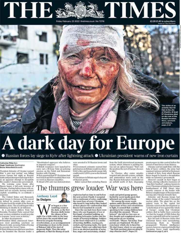The Times gazetesi, manşetinde "Avrupa için karanlık bir gün" ifadelerine yer verdi. Hava saldırıların ardından Rusya'nın Kiev'i kuşattığını yazan gazete, yine aynı şekilde yaralanmış kadının fotoğrafını birinci sayfasından okurlarına aktardı.
