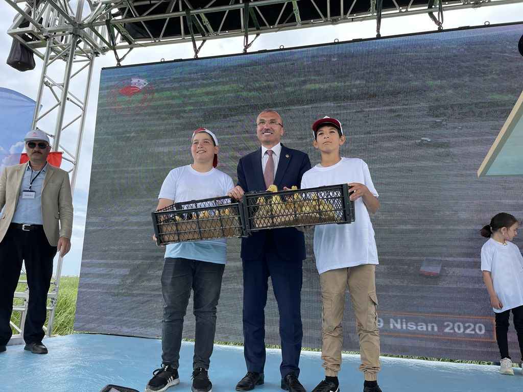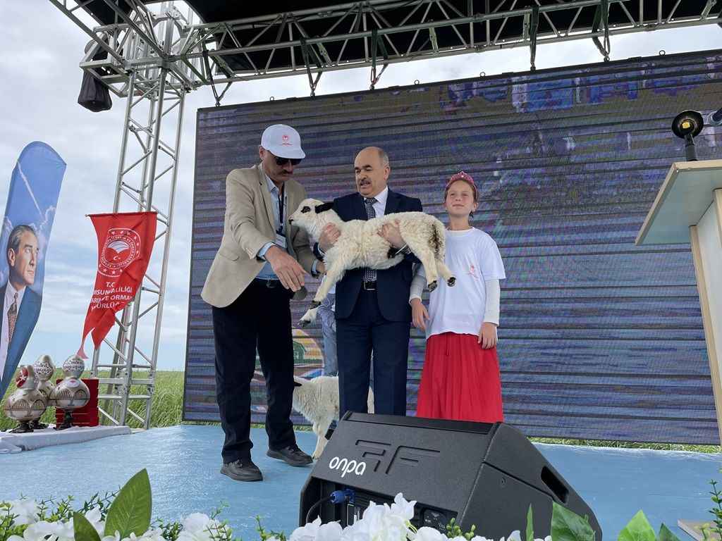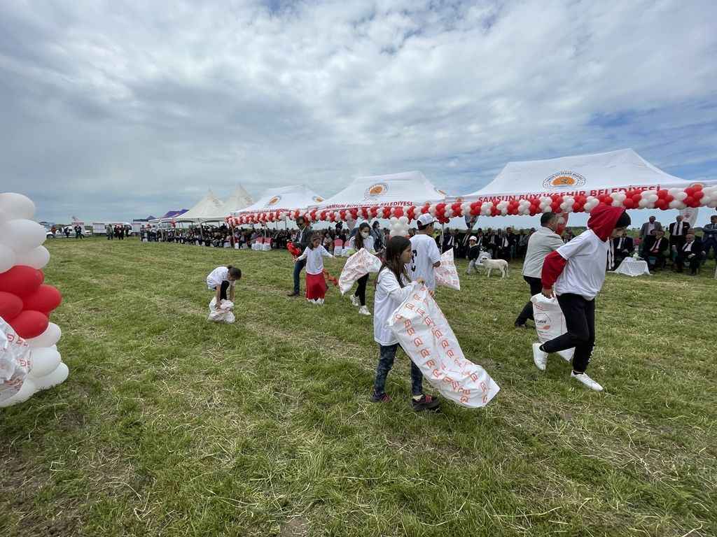 Samsun'un Bafra ilçesinde Mera Islahı ve Amenajman Projesi'nin açılışında yapılan yumurta taşıma ve çuval yarışında derecelere giren çocuklara kuzu ve civciv hediye edildi.