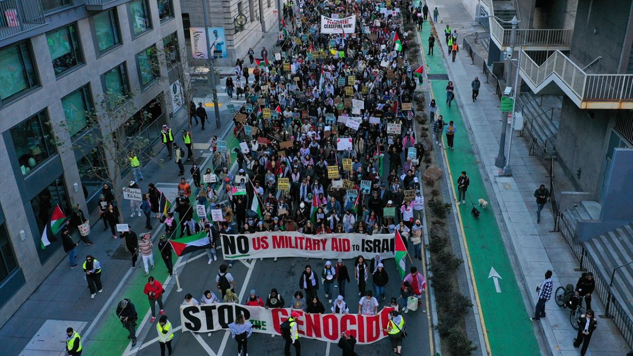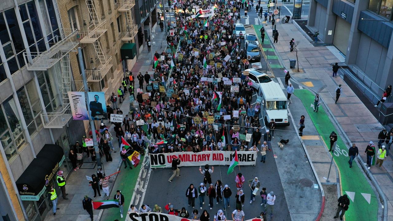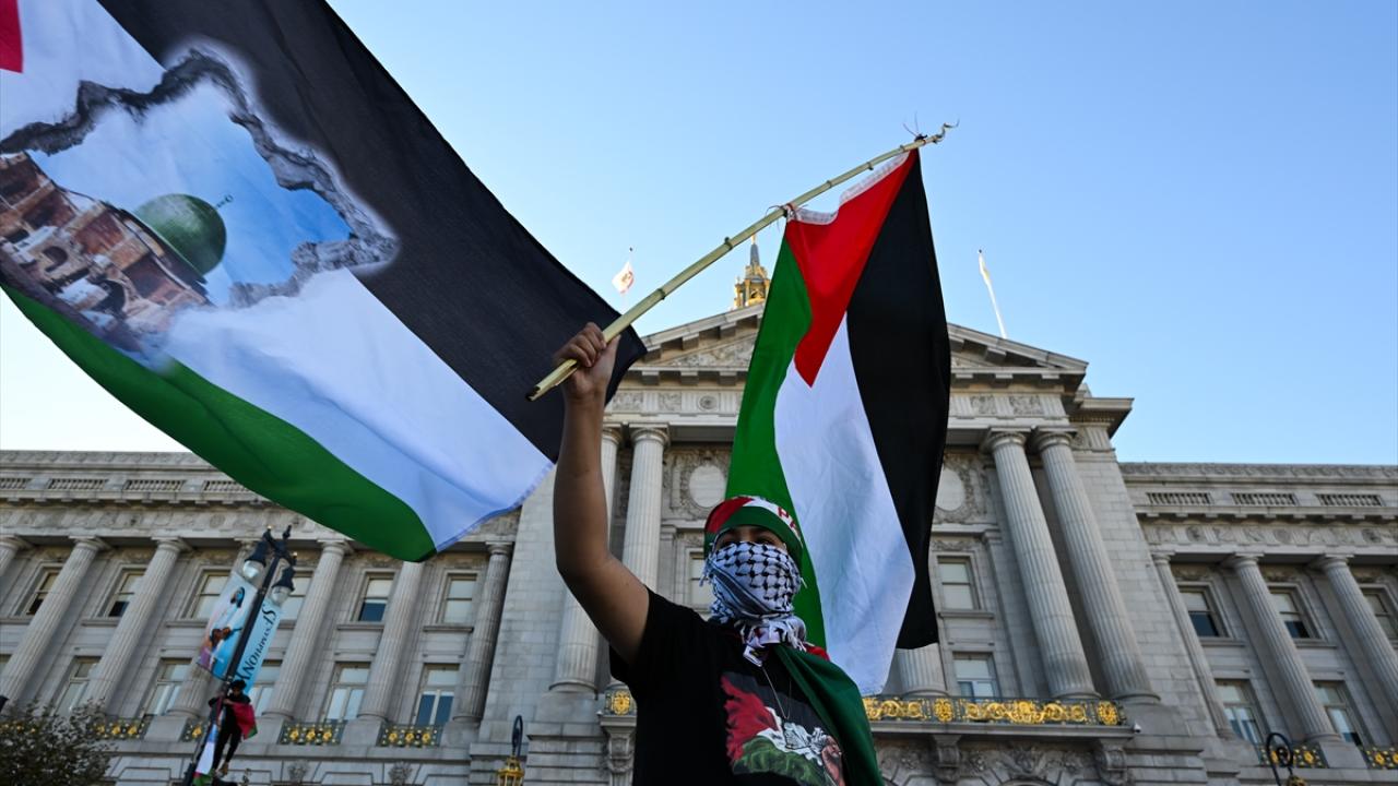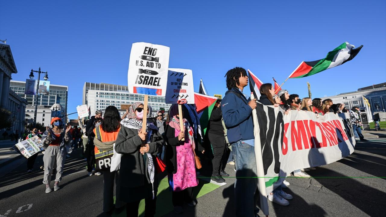 ABD'nin San Francisco kentinde belediye binası önünde toplanan göstericiler, İsrail'in Gazze'ye saldırılarını protesto etti.