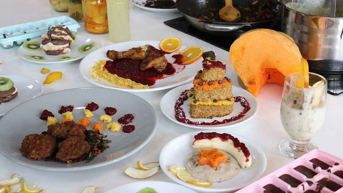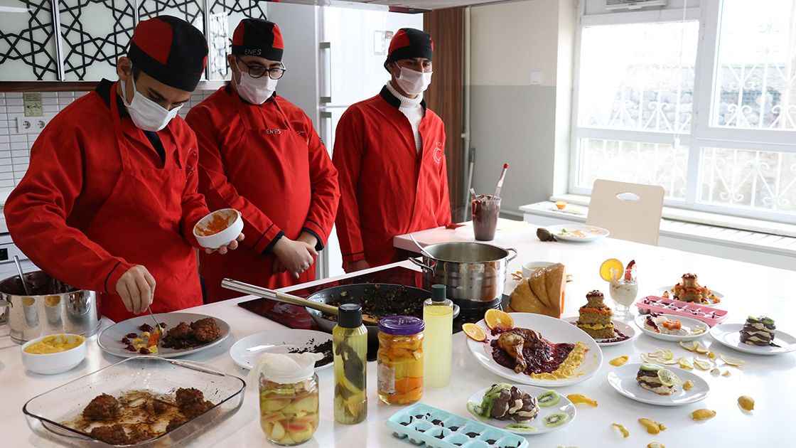 Yiyecek içecek atölyesinde eğitim alan öğrenciler, bazı sebze ve meyvelerden köfte, balkabağı kabuğundan çorba, ekmek kırıntısından tatlı, muz kabuğundan muhallebi, portakal kabuğundan çikolata ve kek gibi yiyecekler yapıyor.