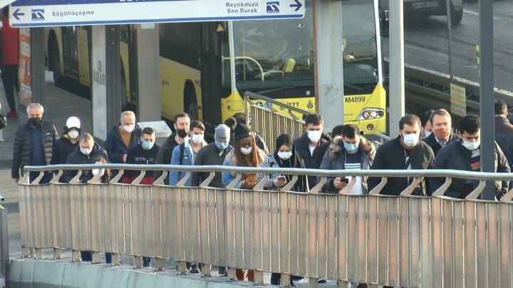 Kadıköy'de vatandaşların mesafeyi korumadan araçlara bindiği ve otobüs kapılarında yoğunluk oluşturduğu gözlendi.