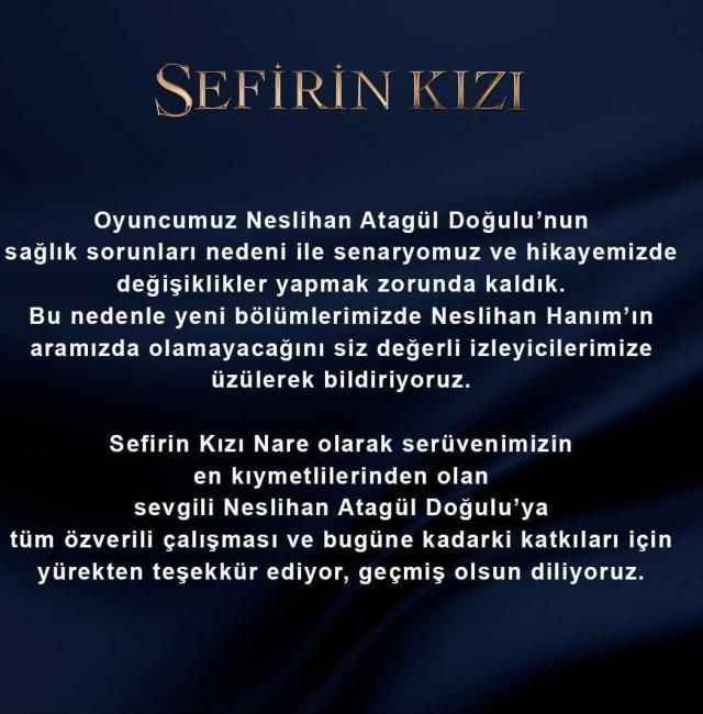 Dizide Nare karakterine hayat veren Neslihan Atagül, aktif kullandığı sosyal medya hesabı üzerinden diziden ayrıldığını duyurmuştu.