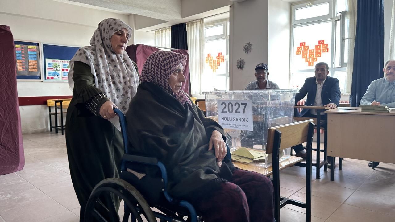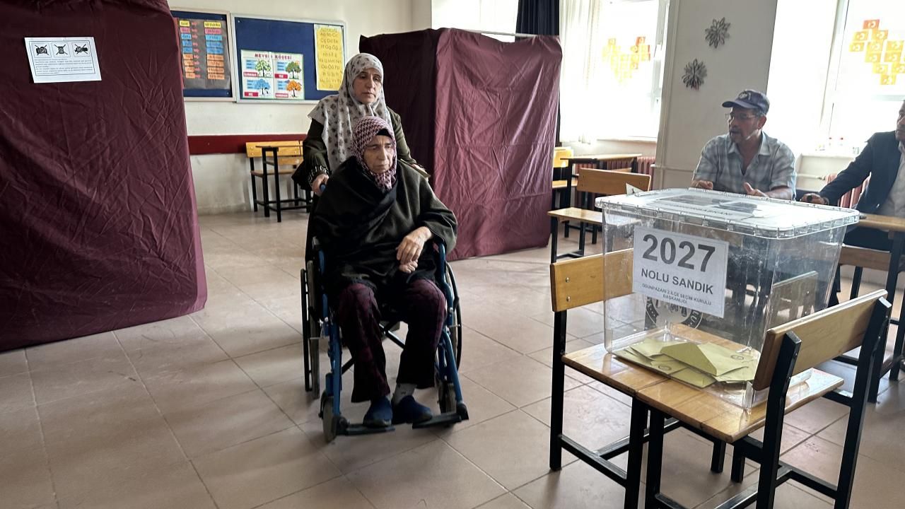 Eskişehir’de yaşayan Kıbrıs şehidinin eşi Hanım Tekin, yürüme engeline rağmen vatandaşlık görevini yerine getirebilmek için tekerlekli sandalyesi ile oy kullanacağı Eti Maden İşletmeleri İlkokulu’na geldi.