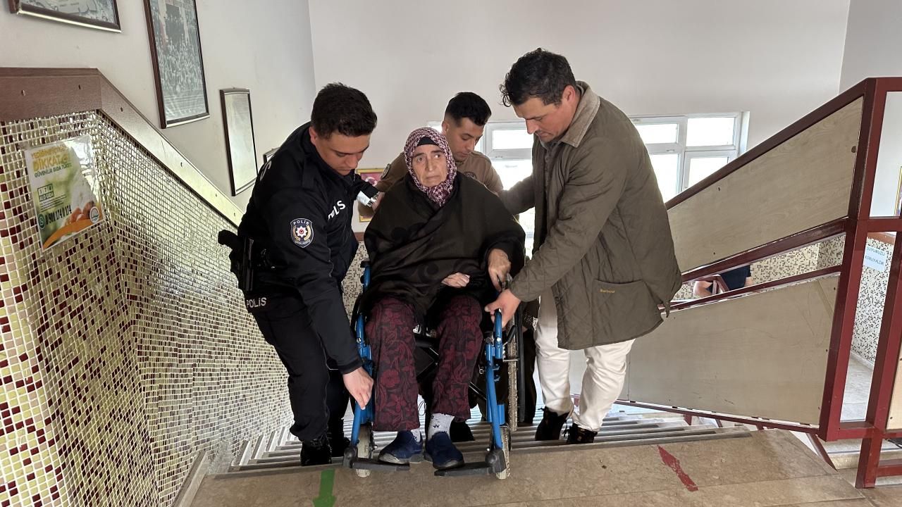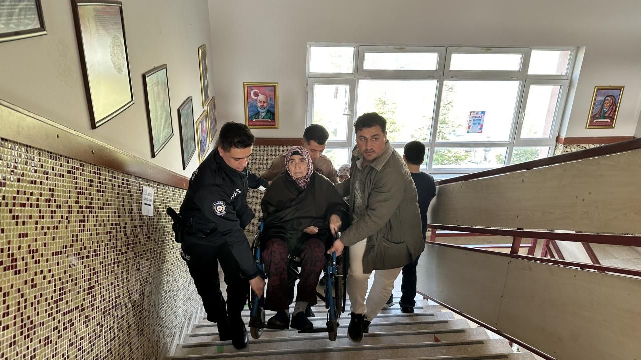 Kolluk kuvvetleri ve çevredeki vatandaşların yardımıyla ikinci kata kadar çıkarılan Tekin, oy kullandıktan sonra tekrar okul bahçesine kadar indirildi.