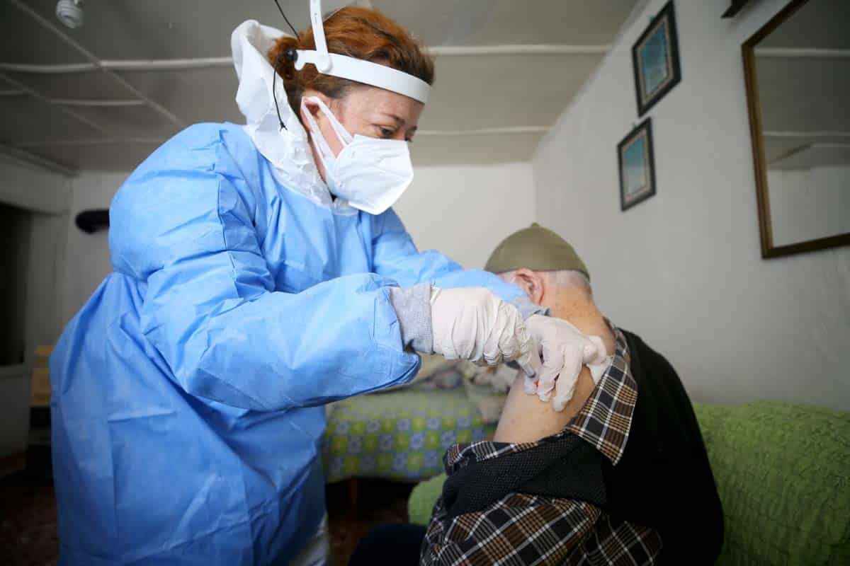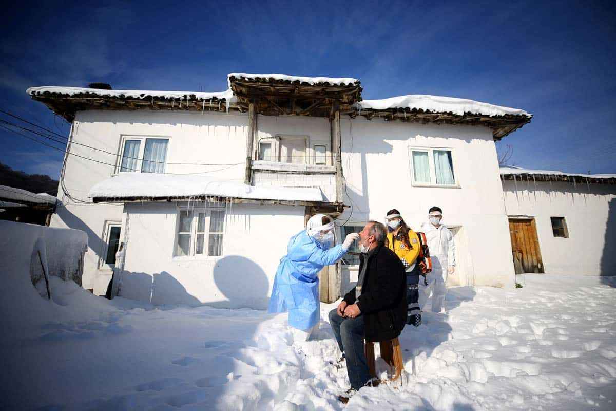 Kar yağışının yoğun olduğu Dereköy'e ulaşan ekip, ilk olarak 90 yaşındaki Selim Böcükler'e evinde aşı yaptı.
