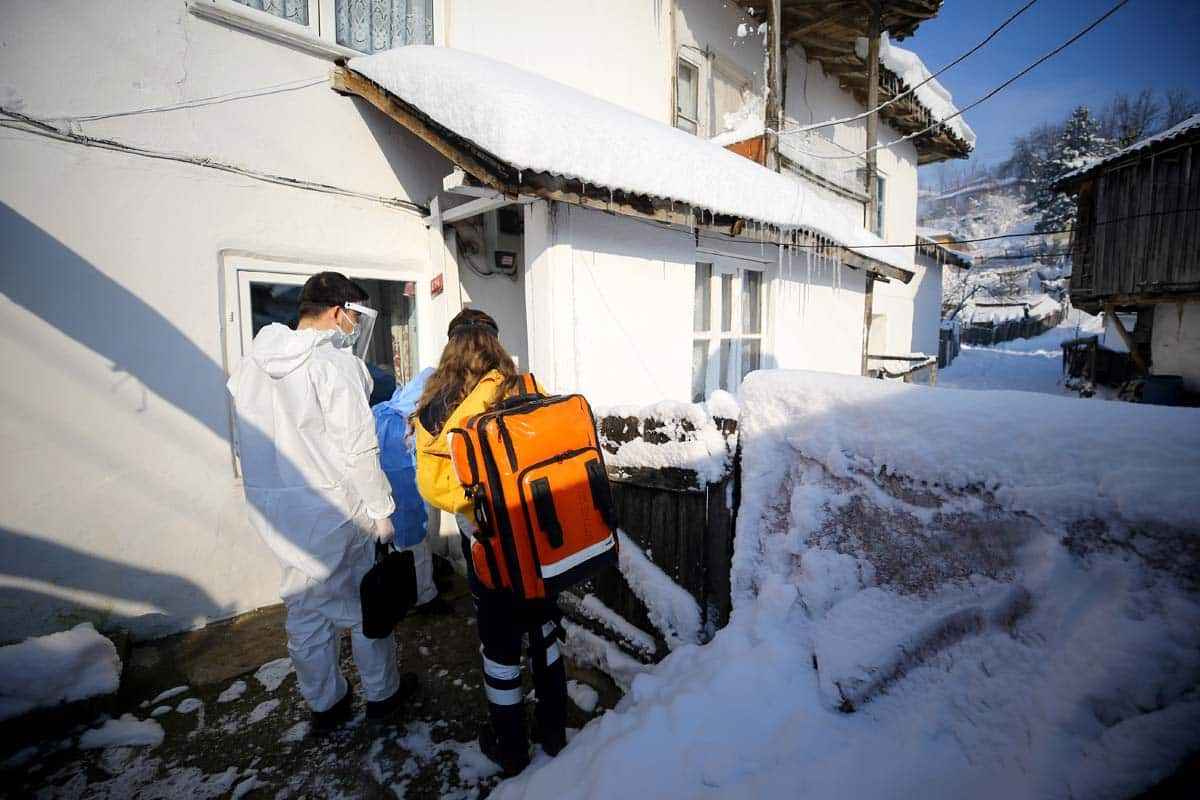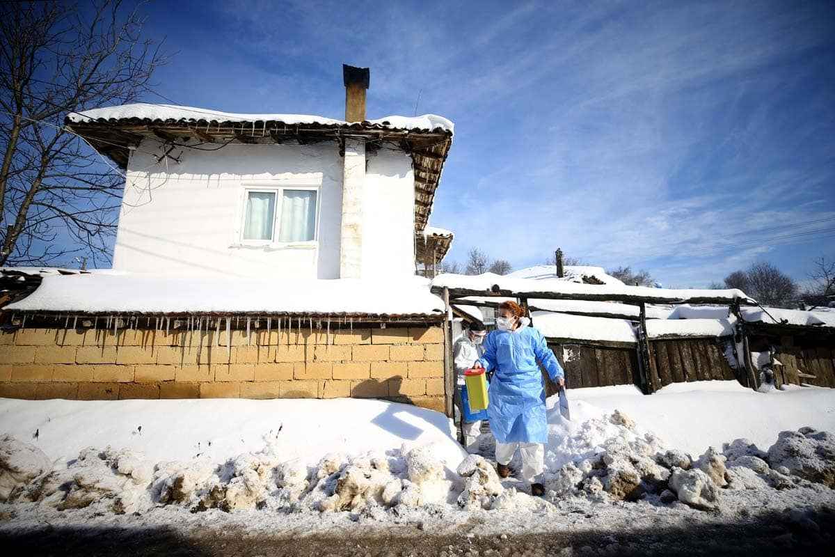 Zorlu kış şartlarında aracın gitmediği bazı evlere yaya ilerlemek zorunda kalan ekip, tüm zorluklara rağmen vatandaşlara hizmet sunmaya gayret gösteriyor.