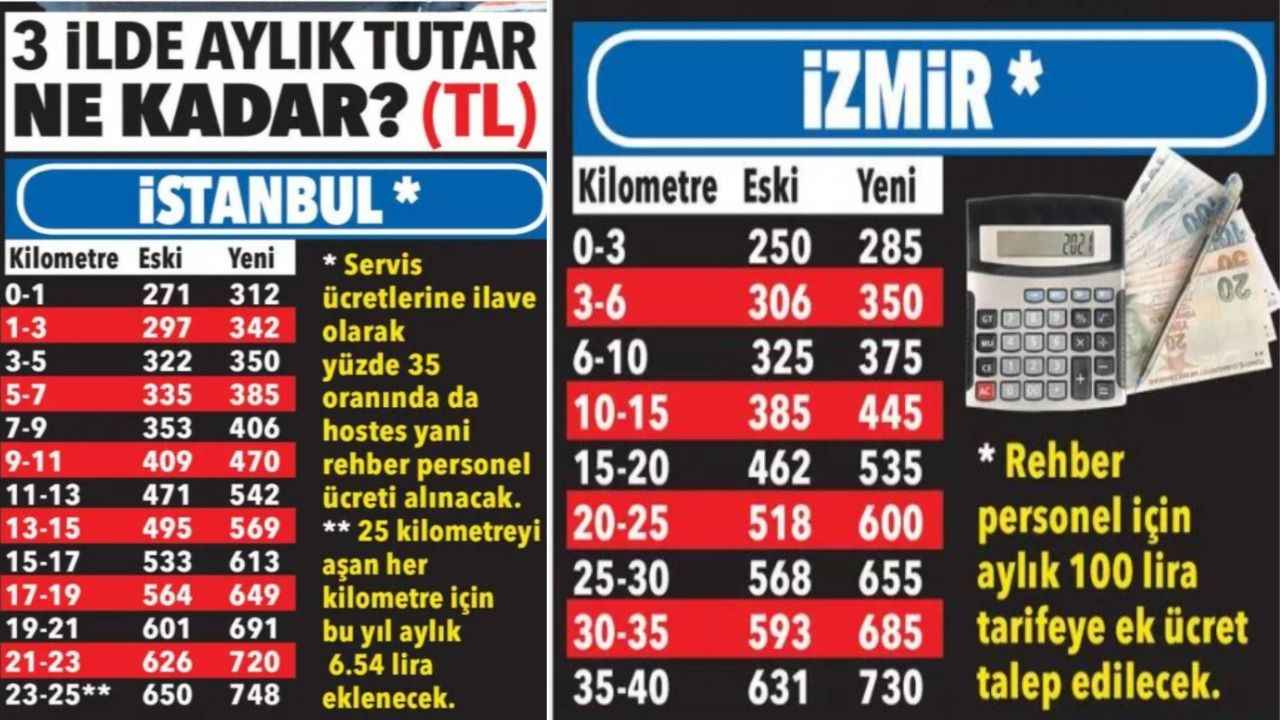 Servis ücreti fiyatları 0-1 kilometre arası 312 lira, 0-3 kilometre arası 348 lira, 3-5 kilometre arası 370 lira, en uzun mesafe, çok öğrenci olmasa da 23-25 kilometre arasında öğrenciler 748 liraya taşınacak. Okul öncesi, ilkokul, ortaokul öğrencilerine bu ücretlere artı olarak yüzde 35 oranında hostes bedeli yansıyacak. Bununla birlikte yapılan zamdan kesinlikle memnun değiliz çünkü giderlerimiz yaklaşık yüzde 40'lara kadar arttı.