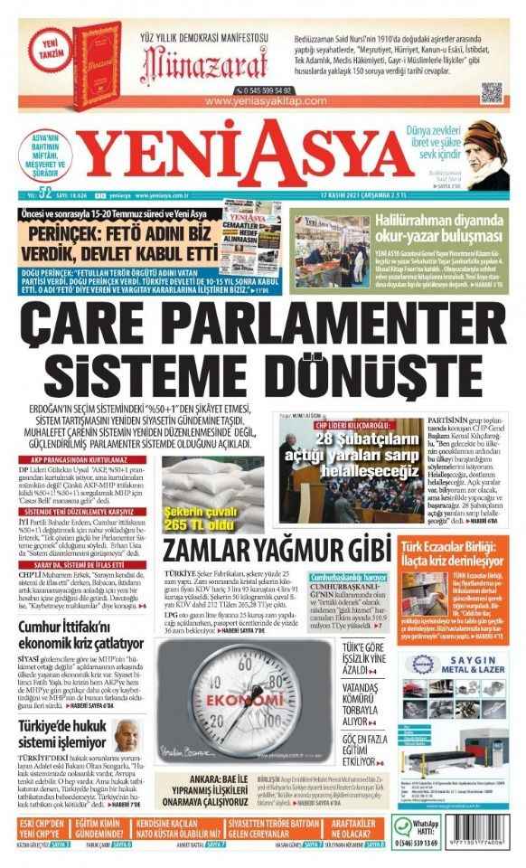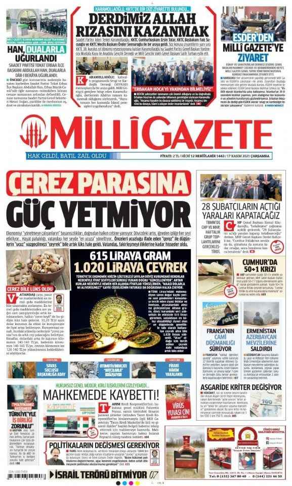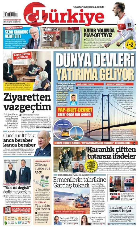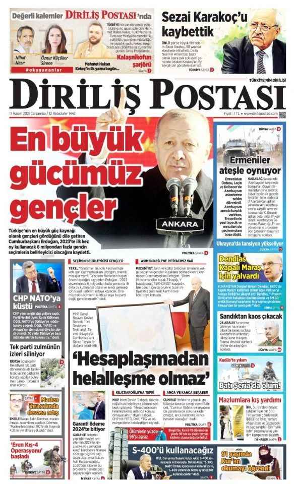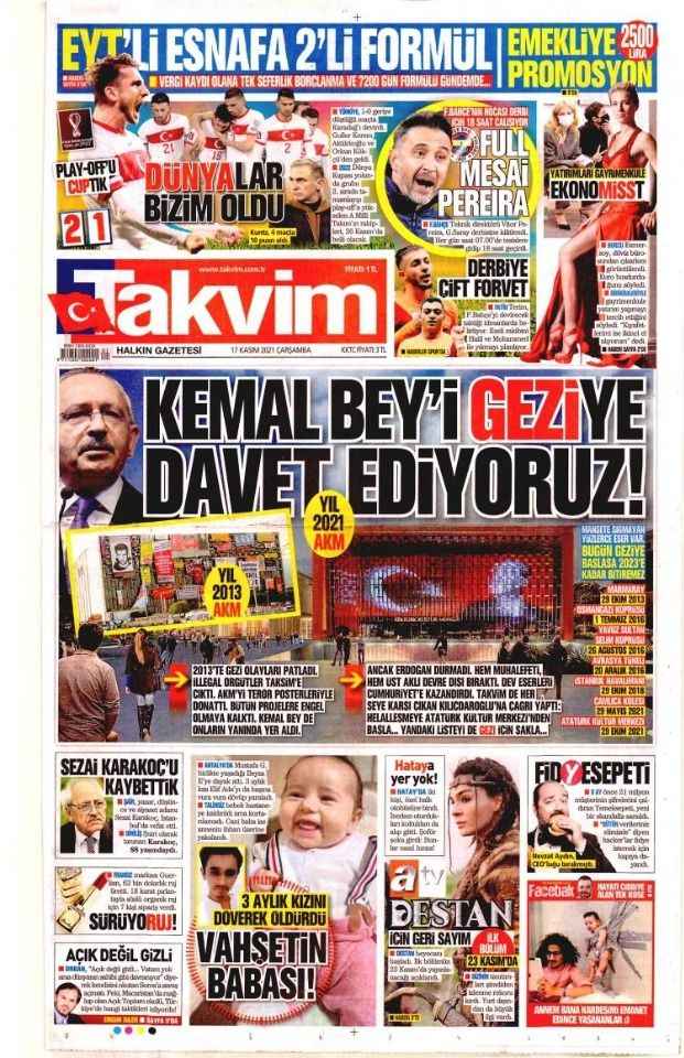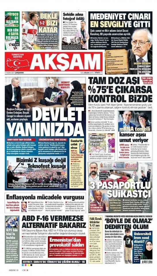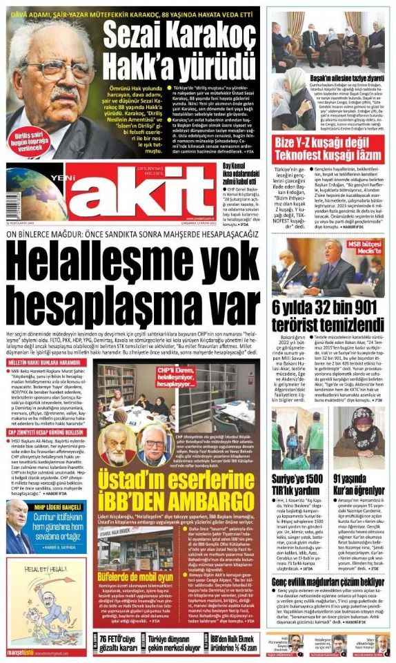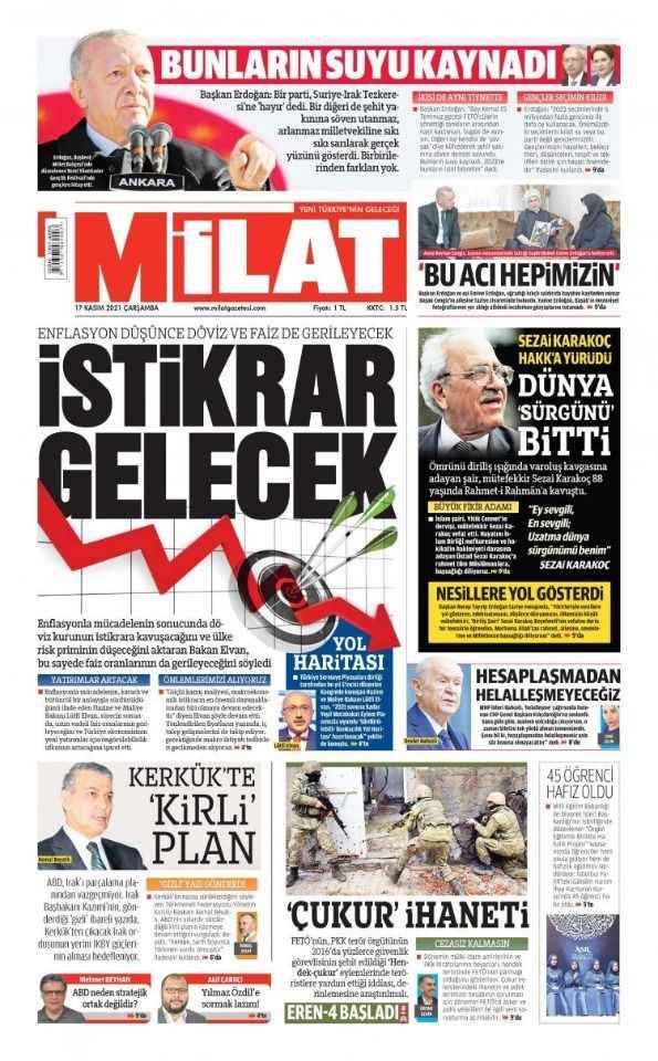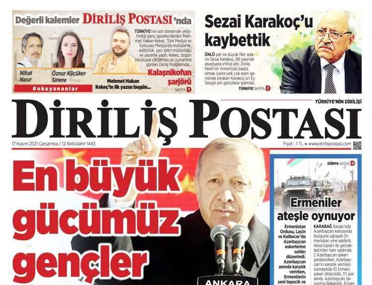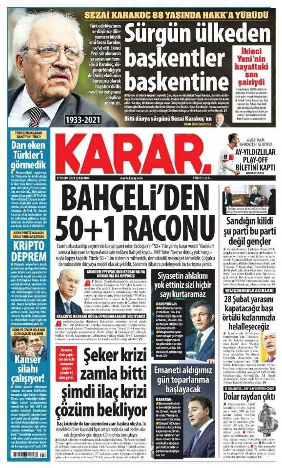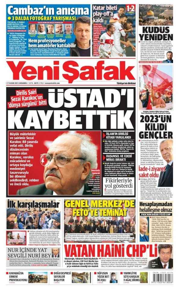 17 Kasım Çarşamba gazete manşetleri. Karakoç'un vefatı gazete manşetlerinde!