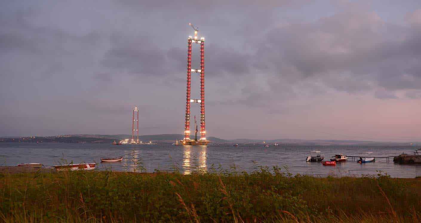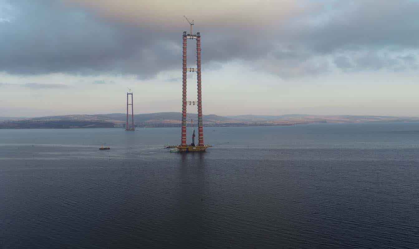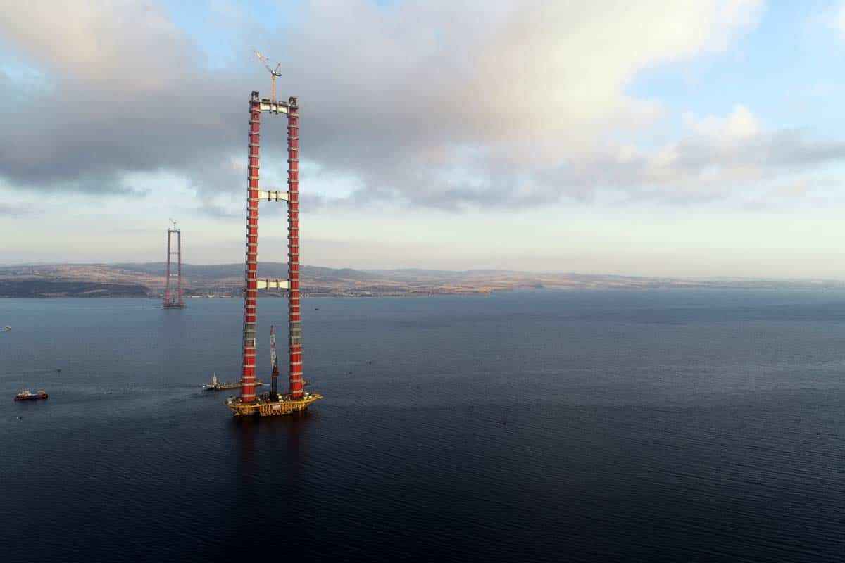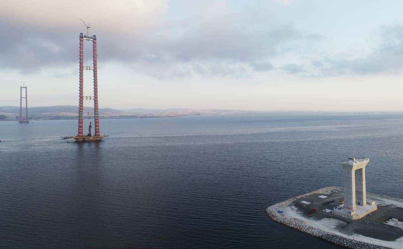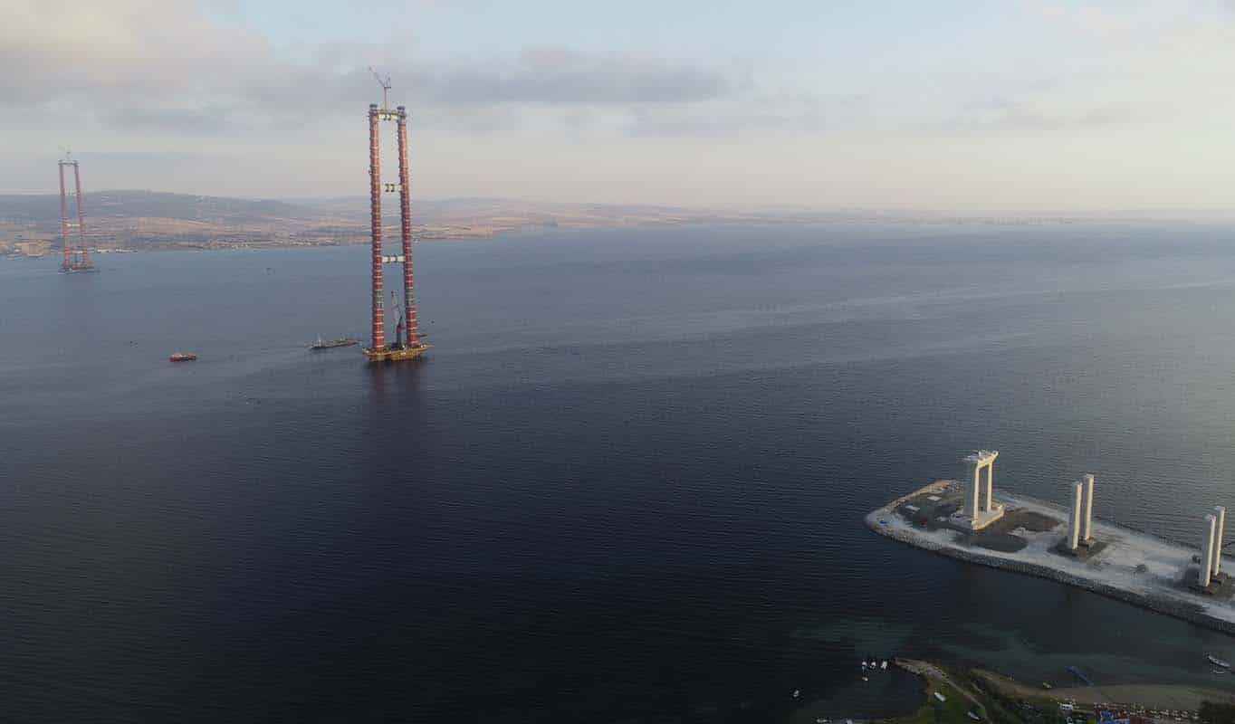 "Çanakkale Boğazı'nın gerdanlığı" olarak nitelendirilen köprüde, her iki yakada suyun içindeki blokların üst üste yerleştirilmesiyle hazırlanan ve Türk bayrağını simgeleyen kırmızı beyaz renklere sahip ayakların tamamlanmasıyla diğer çalışmalara ağırlık verildi.