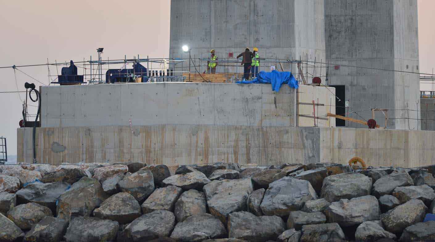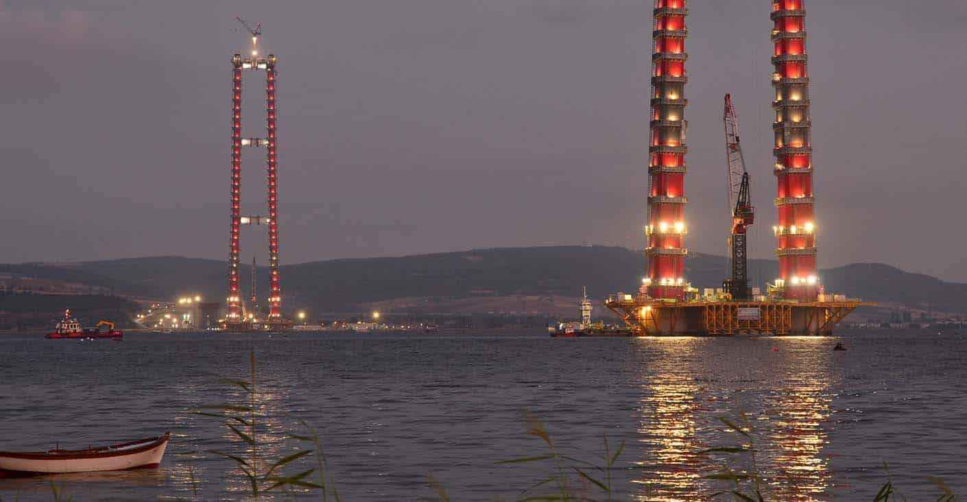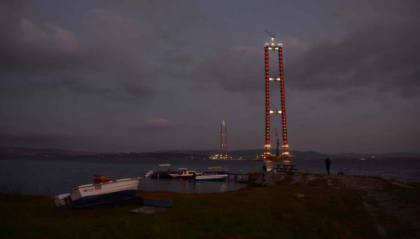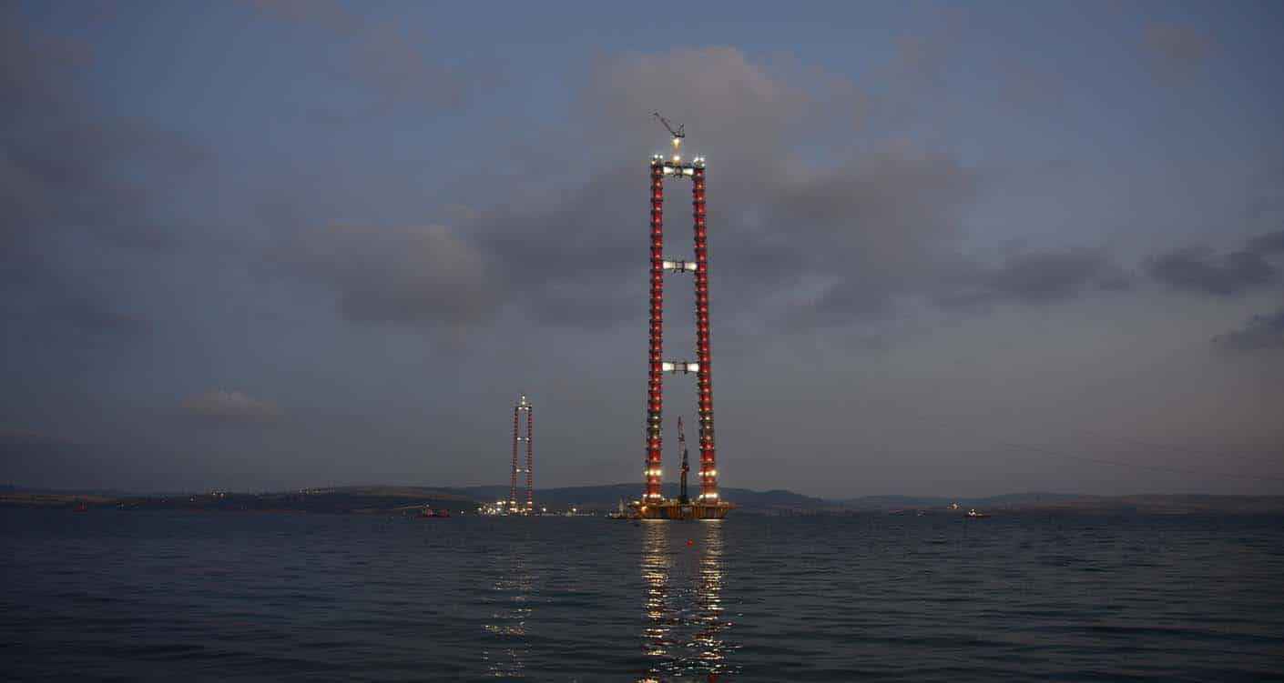 "Çanakkale Boğazı'nın gerdanlığı" olarak nitelendirilen köprüde, her iki yakada suyun içindeki blokların üst üste yerleştirilmesiyle hazırlanan ve Türk bayrağını simgeleyen kırmızı beyaz renklere sahip ayakların tamamlanmasıyla diğer çalışmalara ağırlık verildi.