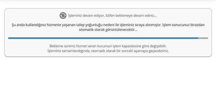 Sistemde yaşanan yoğunluk sebebiyle karşınıza "Sistemde yaşanan bir teknik aksaklık nedeni ile işleminiz tamamlanamadı." ya da işleminiz devam ediyor şeklinde bir uyarı çıkabilecektir. Bu durumda işleminizin devam etmesini beklemeniz gerekmektedir.