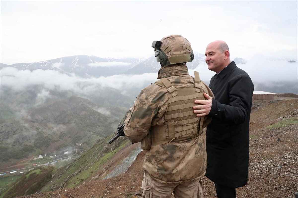 Askerlerin Ramazan Bayramı'nı tebrik eden Bakan Soylu, bir süre üs bölgesi çevresinde incelemelerde bulundu, nöbet tutan askerlerle sohbet etti.