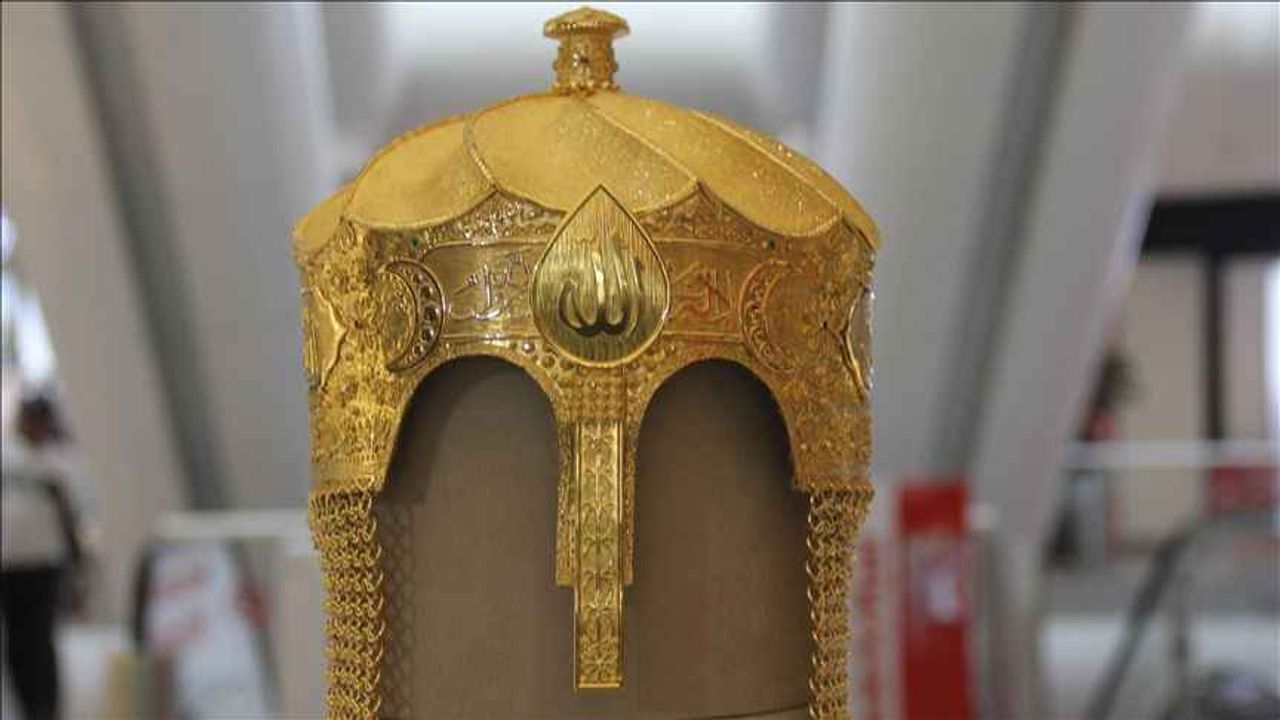 Alparslan'ın Malazgirt Zaferi'nde taktığı miğferin kopyasını inceleyen ziyaretçiler, fotoğraf çekti.