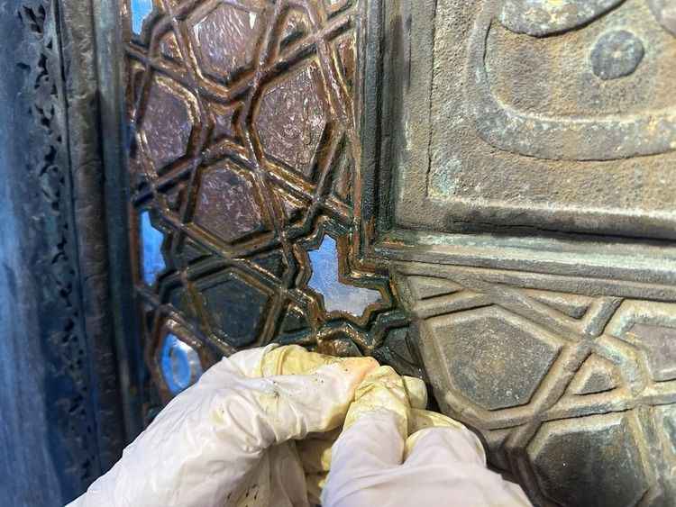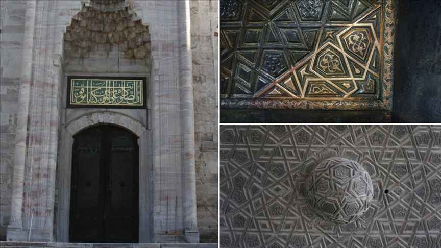 Ersoy, caminin revaklı avlusuna 3 yönden bronz kapılarla girildiğini, bu kapıların geometrik geçmeleri dışında, ajurlu demir menteşe klapalarının bile kazıma tekniğiyle işlendiğini, kapılarda rumi desenlere yer verildiğini aktardı.