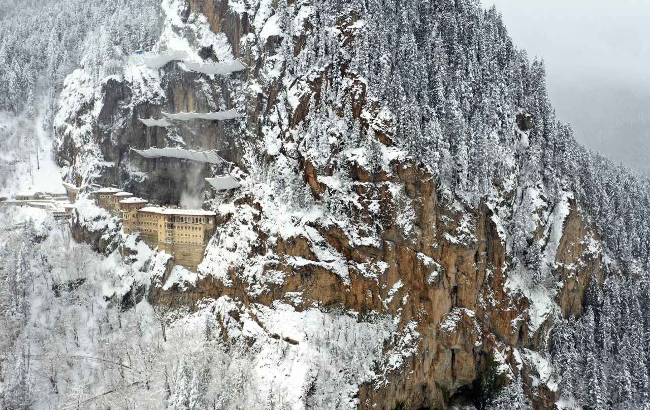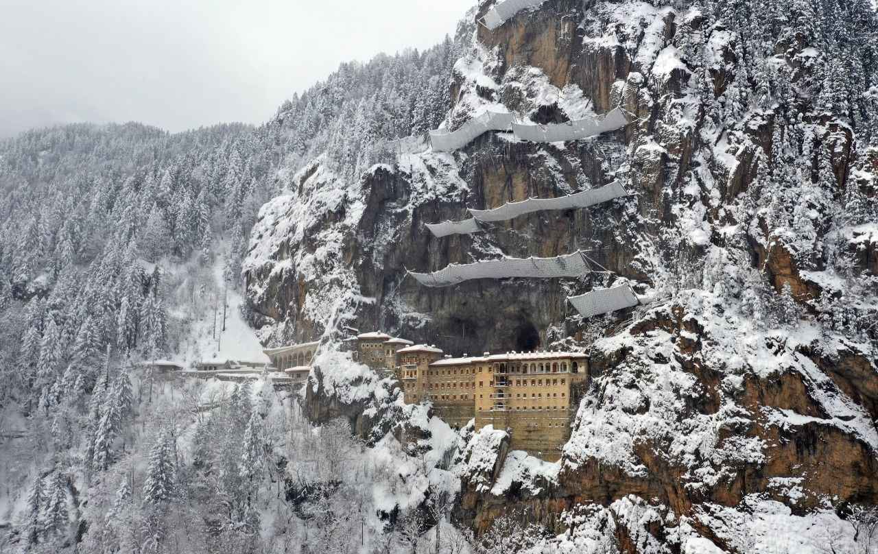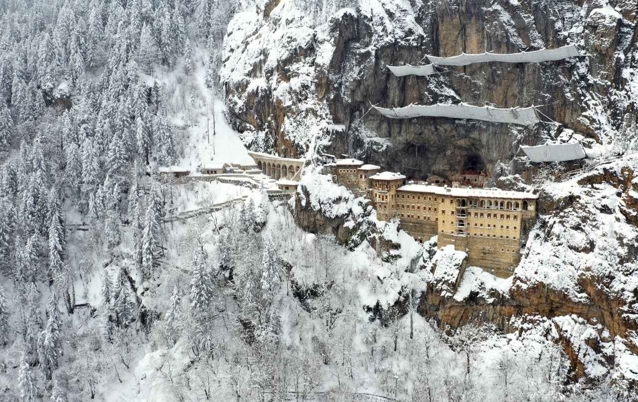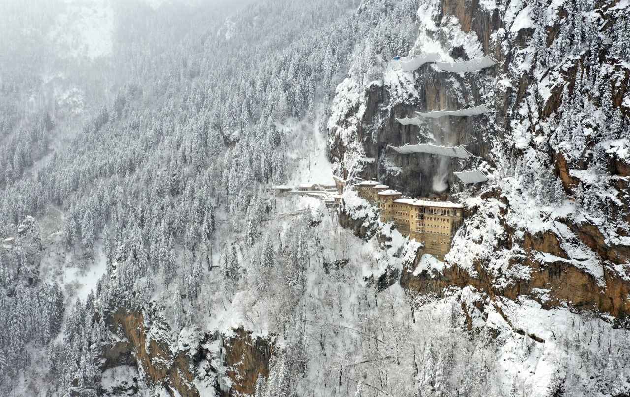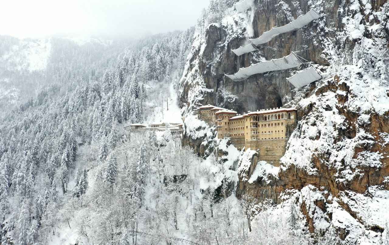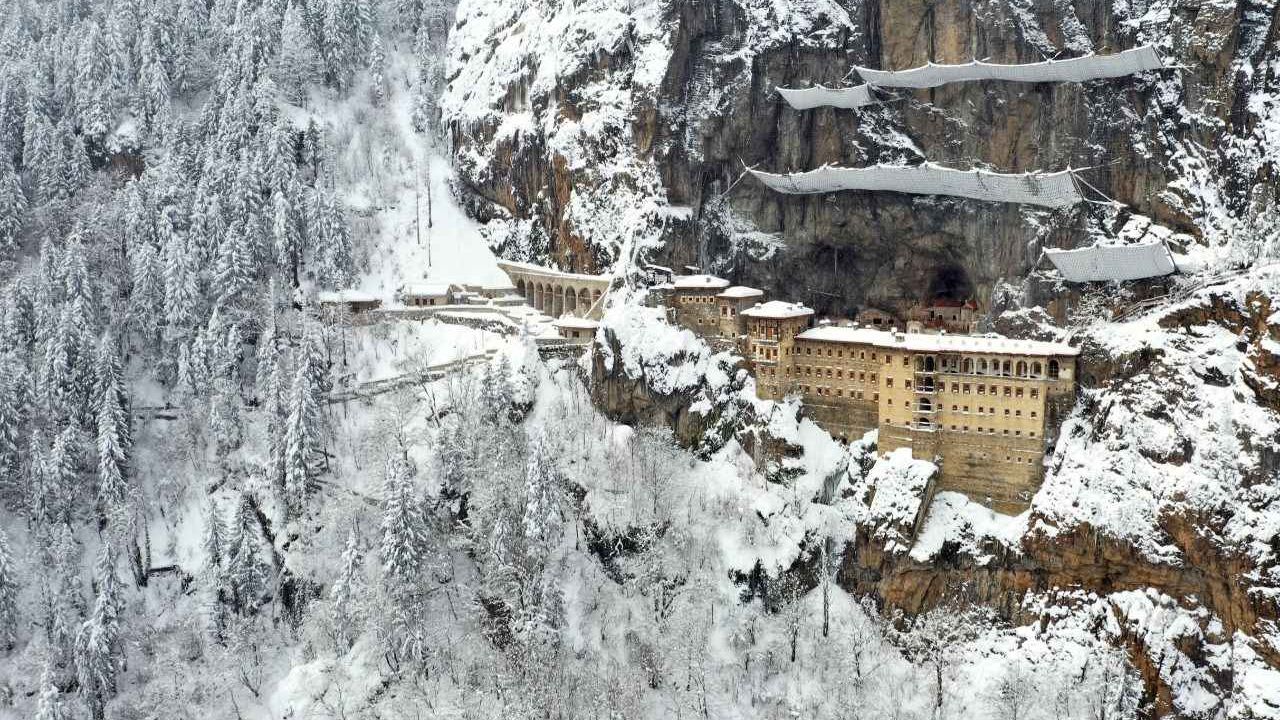 Sümela Manastırı ve Altındere Vadisi'ndeki kar manzaraları havadan görüntülendi.